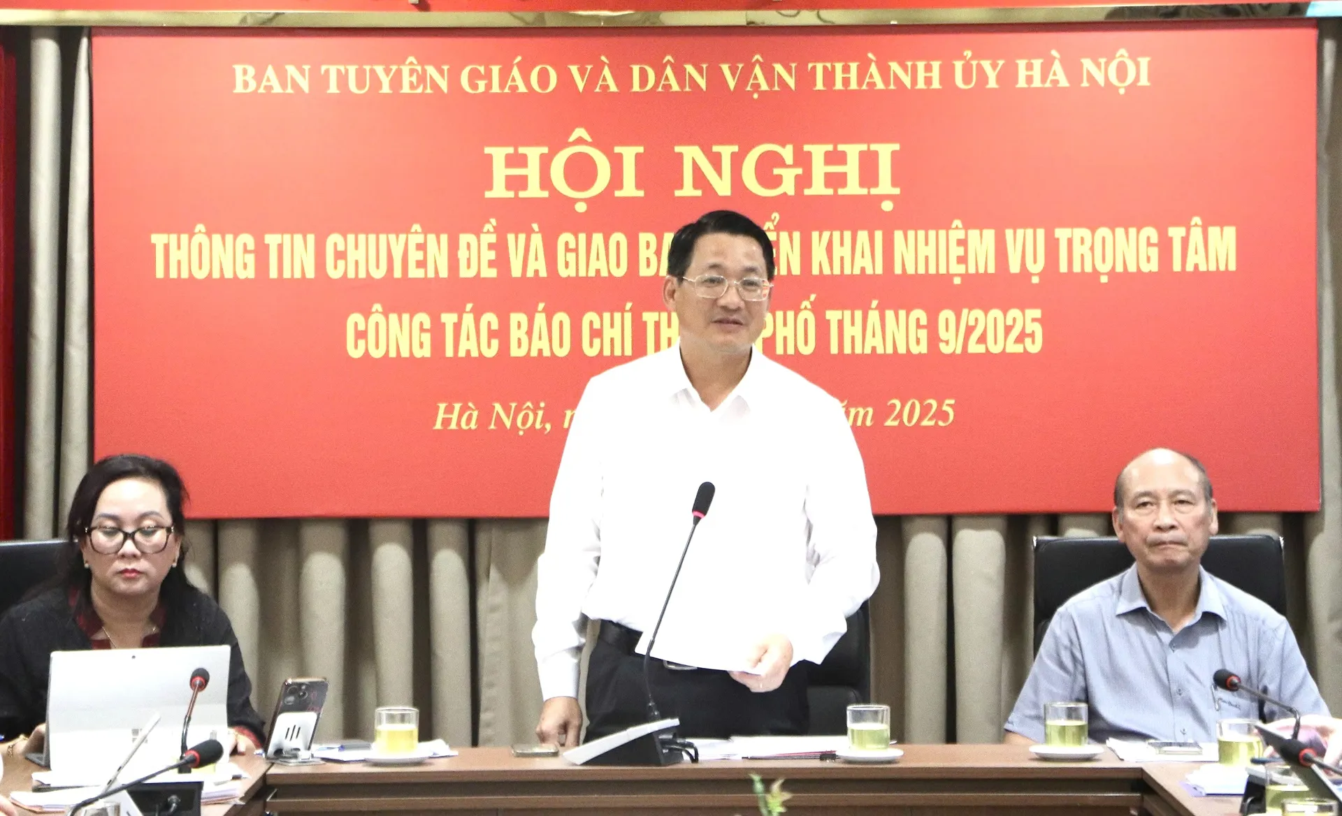 Chiều 11-9, Ban Tuyên giáo và Dân vận Thành ủy Hà Nội tổ chức hội nghị giao ban báo chí tháng 9-2025. Hội nghị đánh giá kết quả tuyên truyền các sự kiện chính trị quan trọng, định hướng nhiệm vụ trọng tâm của báo chí Thủ đô trong thời gian tới, tạo khí thế mới, đồng thuận xã hội, hướng tới thành công Đại hội XVIII Đảng bộ thành phố. Đồng chí Vũ Hà, Thành ủy viên, Phó Trưởng ban Thường trực Ban Tuyên giáo và Dân vận Thành ủy chủ trì hội nghị.