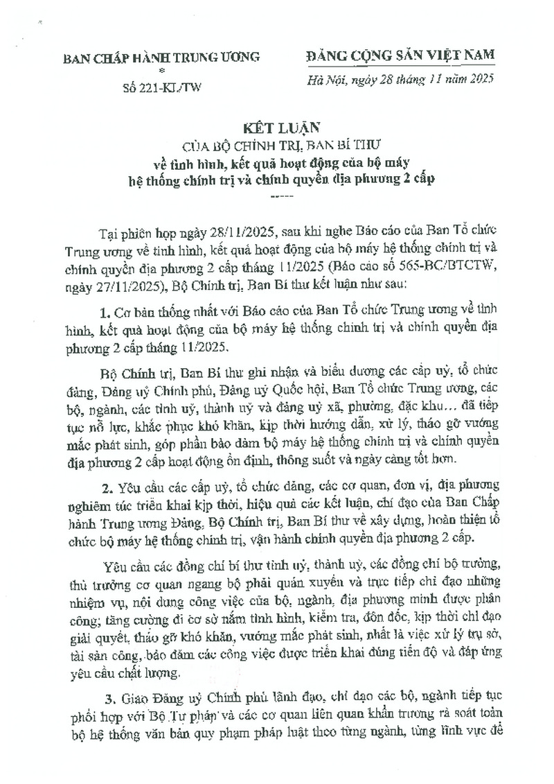 Kết luận số 221-KL/TW ngày 28/11/2025 của Bộ Chính trị, Ban Bí thư về tình hình, kết quả hoạt động của bộ máy hệ thống chính trị và chính quyền địa phương 2 cấp