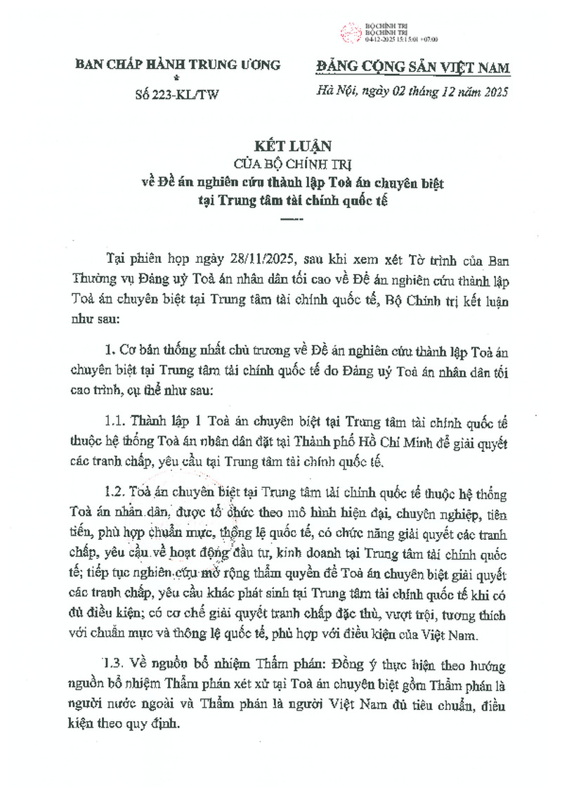 Kết luận số 223-KL/TW, ngày 02/12/2025 của Bộ Chính trị về Đề án nghiên cứu thành lập Toà án chuyên biệt tại Trung tâm tài chính quốc tế