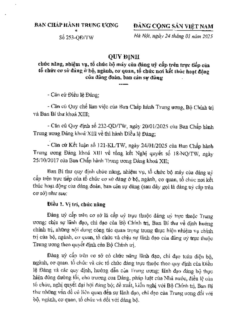 Quy định số 253-QĐ/TW ngày 24/01/2025 của Bộ Chính trị về chức năng, nhiệm vụ, tổ chức bộ máy của đảng uỷ cấp trên trực tiếp của tổ chức cơ sở đảng ở bộ, ngành, cơ quan, tổ chức nơi kết thúc hoạt động của đảng đoàn, ban cán sự đảng