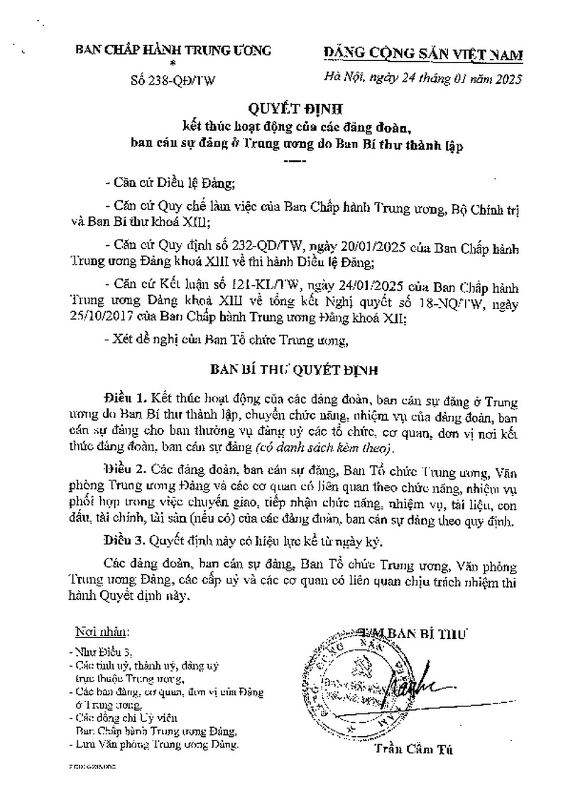 Quyết định số 238-QĐ/TW ngày 24/01/2025 của Ban Bí thư về kết thúc hoạt động của các đảng đoàn, ban cán sự đảng ở Trung ương do Ban Bí thư thành lập
