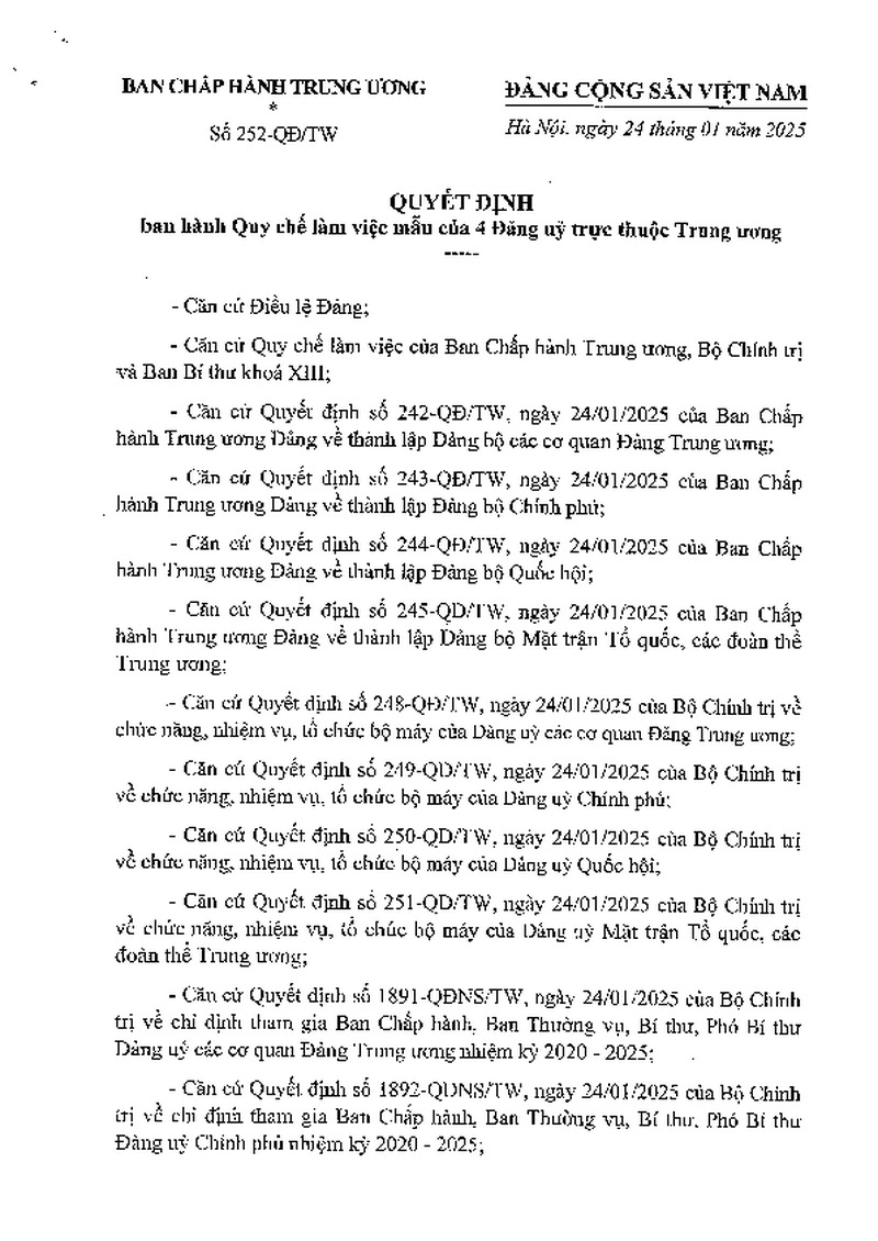 Quyết định số 252-QĐ/TW ngày 24/01/2025 của Bộ Chính trị ban hành Quy chế làm việc mẫu của 4 Đảng uỷ trực thuộc Trung ương
