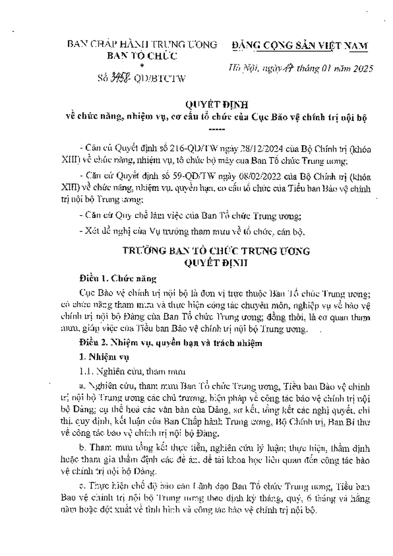 Quyết định số 3458-QĐ/BTCTW ngày 17/01/2025 của Ban Tổ chức Trung ương về chức năng, nhiệm vụ, cơ cấu tổ chức của Cục Bảo vệ chính trị nội bộ