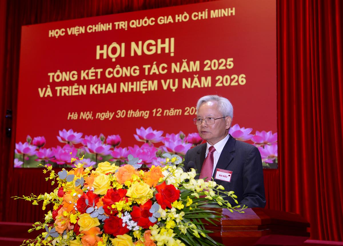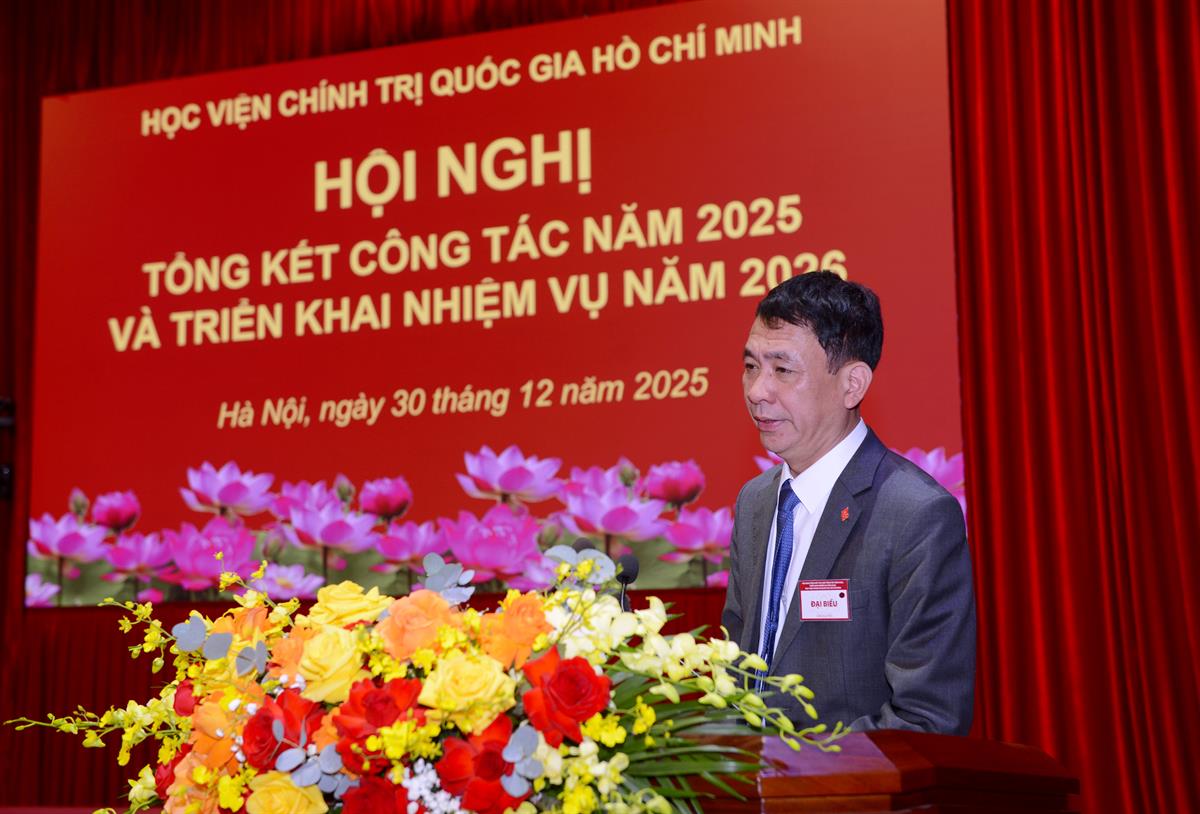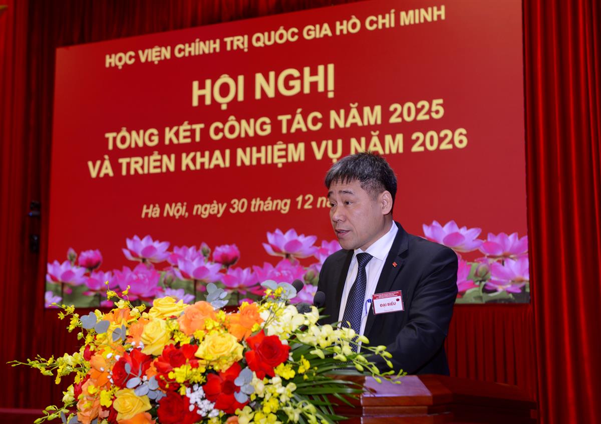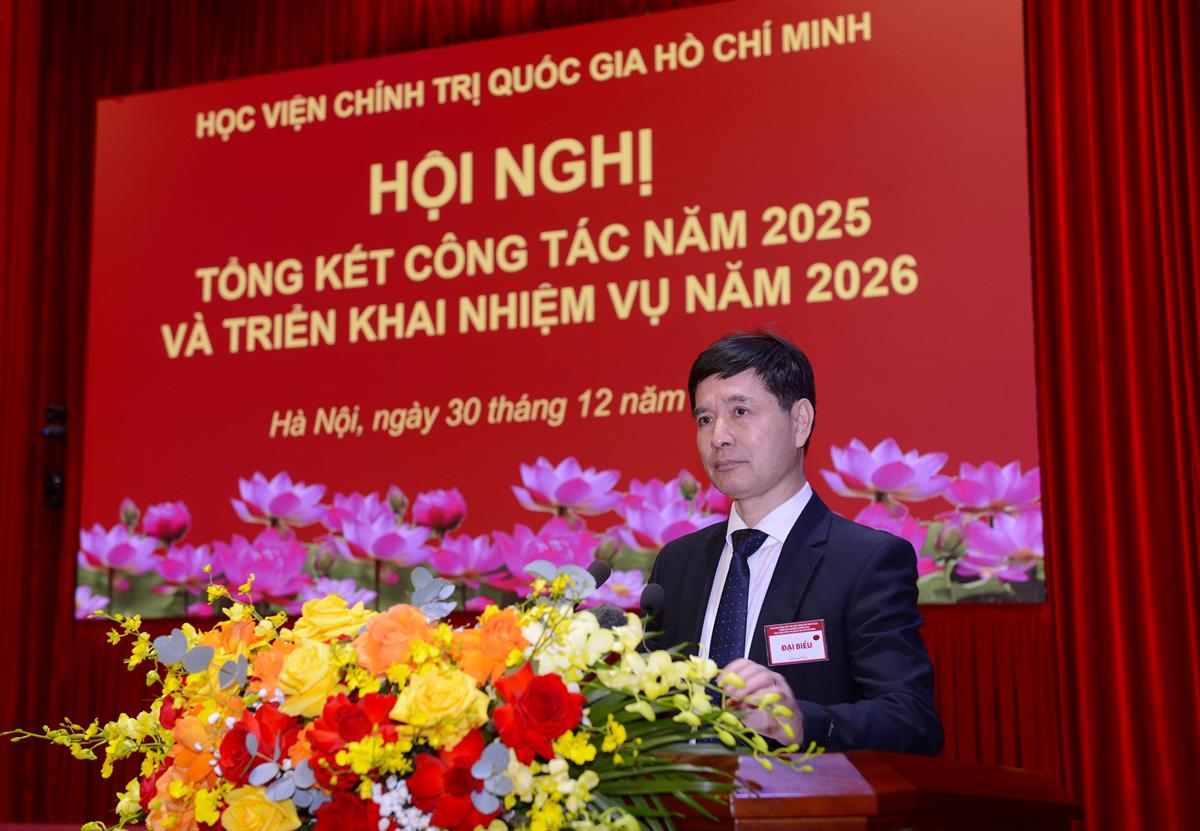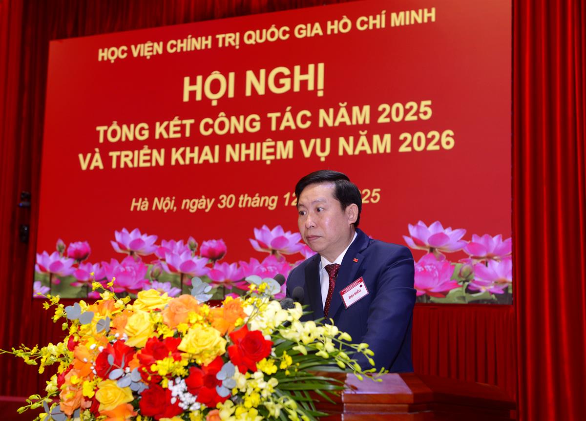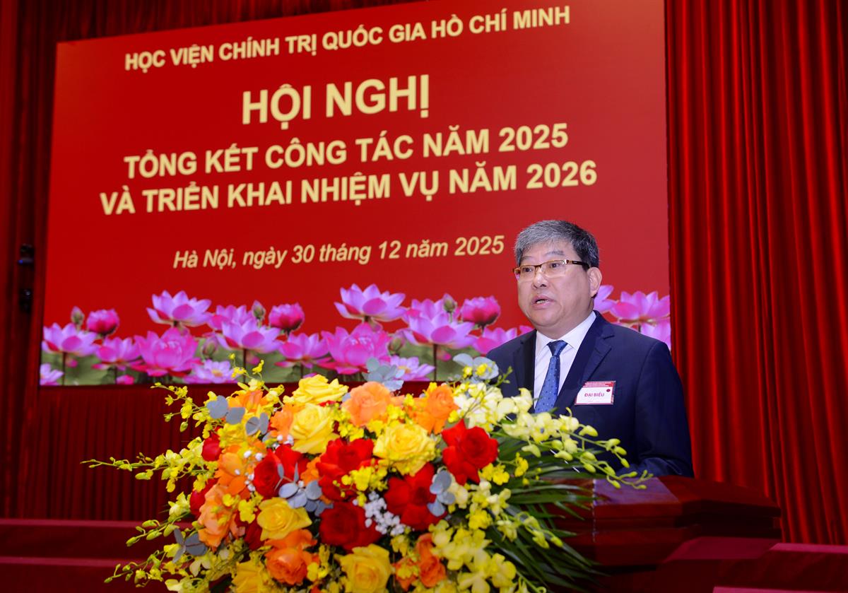 PGS,TS Đoàn Minh Huấn, Uỷ viên Ban Chấp hành Trung ương Đảng, Phó Giám đốc thường trực Học viện Chính trị quốc gia Hồ Chí Minh trình bày tóm tắt Báo cáo tổng kết công tác năm 2025, phương hướng, nhiệm vụ năm 2026