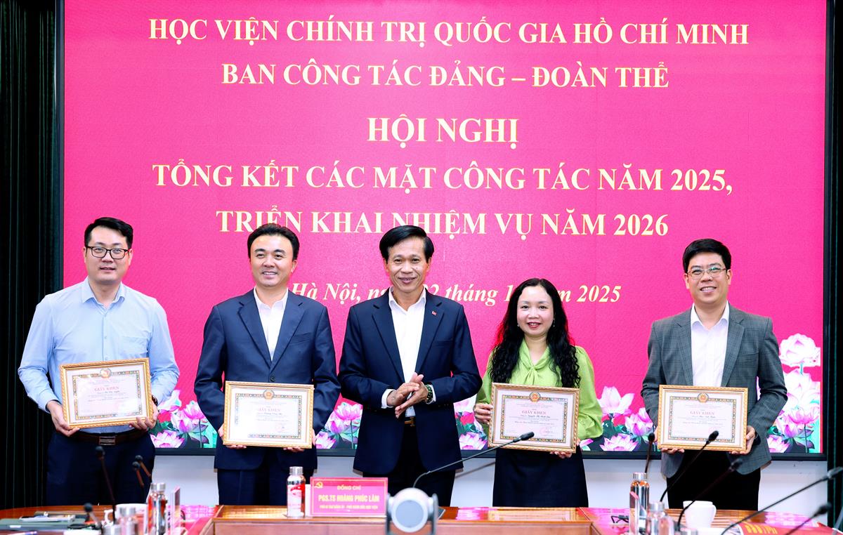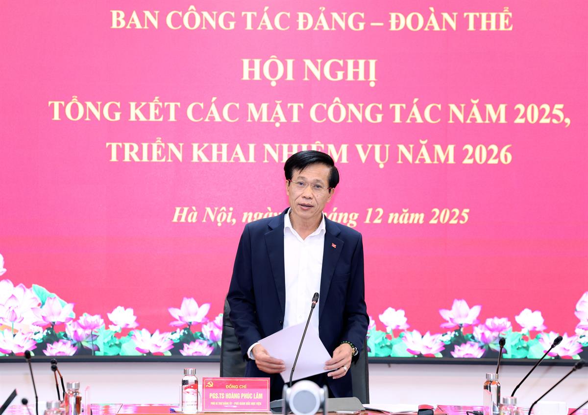 Phát biểu chỉ đạo, kết luận Hội nghị, PGS,TS Hoàng Phúc Lâm, Phó Bí thư Đảng ủy, Phó Giám đốc Học viện đánh giá cao công tác chuẩn bị Hội nghị được triển khai nghiêm túc, chu đáo; các báo cáo được xây dựng công phu, toàn diện, phản ánh đầy đủ các mặt công tác của Ban. Thay mặt Ban Giám đốc và Thường trực Đảng ủy Học viện, đồng chí ghi nhận, biểu dương và chúc mừng những kết quả quan trọng mà Ban Công tác Đảng - Đoàn thể đã đạt được trong năm 2025.