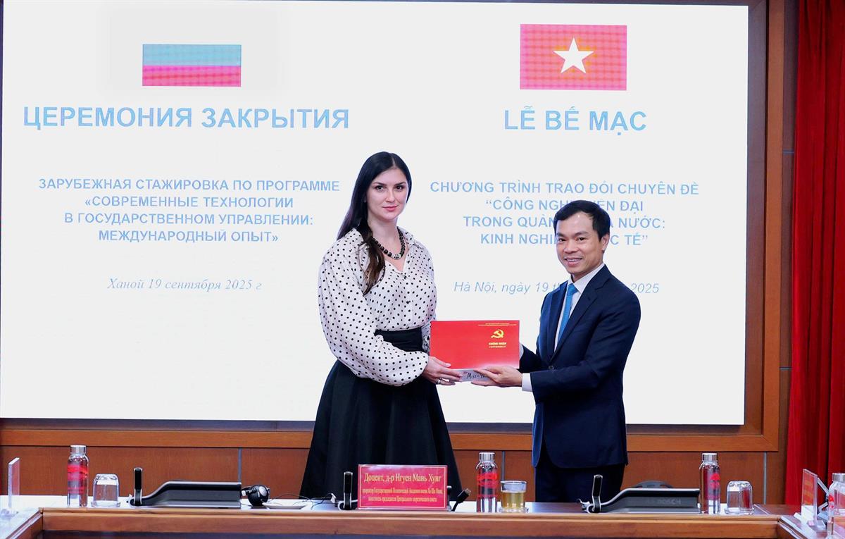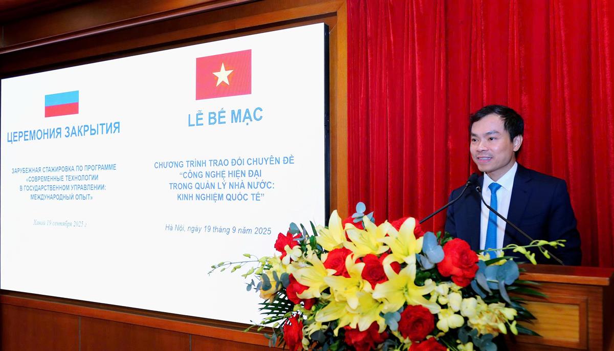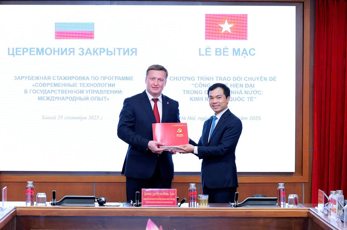 Chiều ngày 19/9/2025, tại Hà Nội, Học viện Chính trị quốc gia Hồ Chí Minh tổ chức Lễ bế mạc Chương trình trao đổi chuyên đề “Công nghệ hiện đại trong quản lý nhà nước, kinh nghiệm quốc tế” dành cho đoàn cán bộ lãnh đạo, quản lý trung, cao cấp của Liên bang Nga. PGS,TS Nguyễn Mạnh Hùng, Phó Giám đốc Học viện Chính trị quốc gia Hồ Chí Minh, Phó Chủ tịch Hội đồng Lý luận Trung ương dự và chủ trì buổi Lễ.