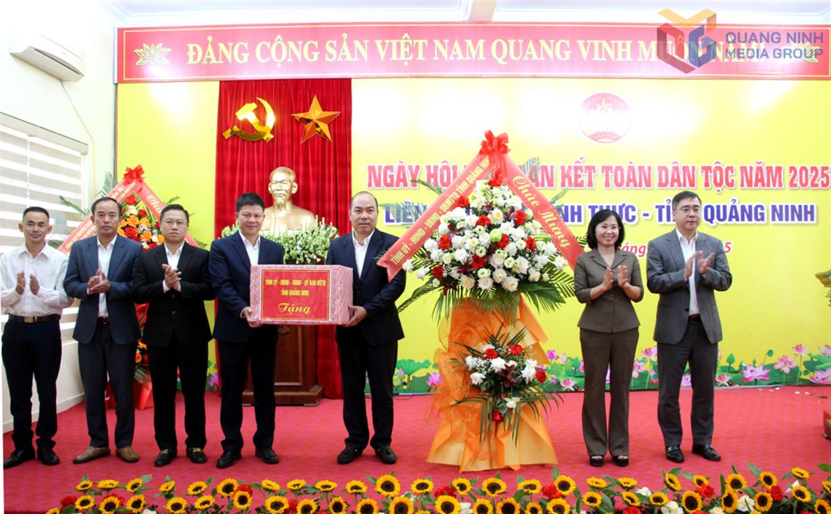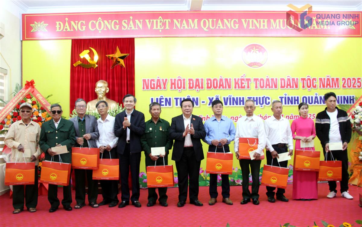 Các đồng chí lãnh đạo tỉnh tặng hoa chúc mừng Ngày hội Đại đoàn kết toàn dân tộc tại xã Vĩnh Thực.