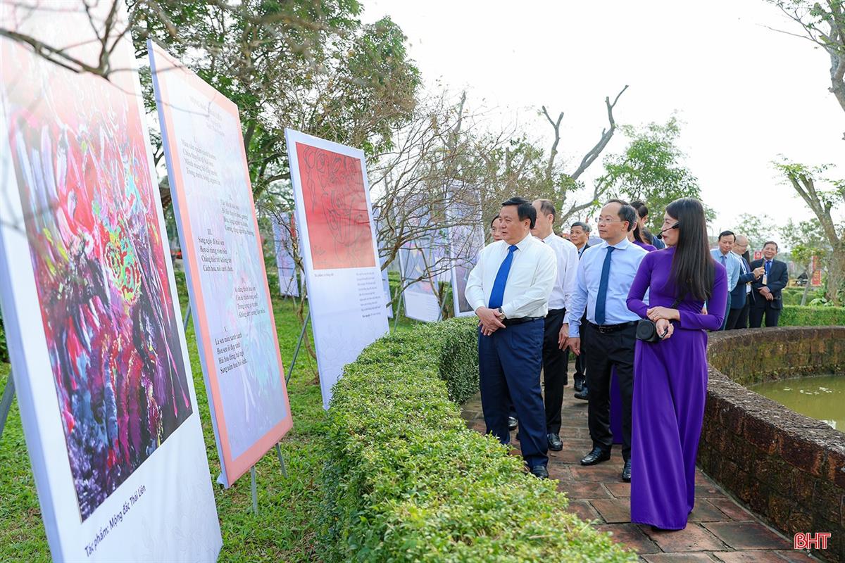 Đồng chí Nguyễn Xuân Thắng và đoàn đại biểu tham quan không gian văn hóa tại Khu lưu niệm Đại thi hào Nguyễn Du.