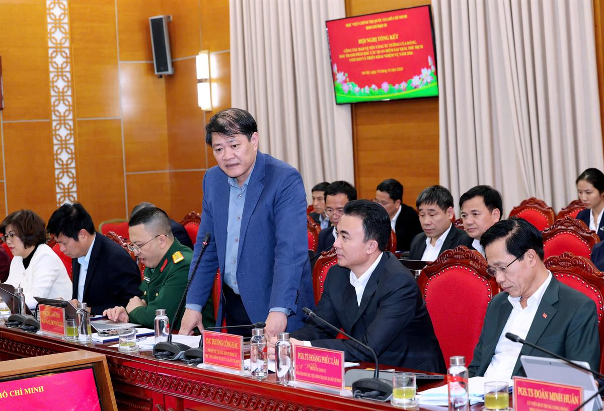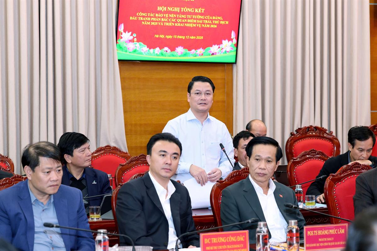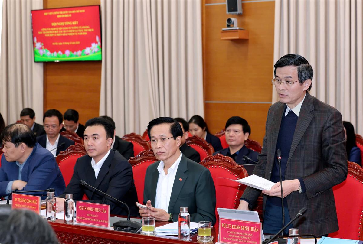 Phát biểu tại hội nghị, PGS,TS Đoàn Minh Huấn, Ủy viên Trung ương Đảng, Phó Giám đốc thường trực Học viện Chính trị quốc gia Hồ Chí Minh bày tỏ sự nhất trí cao với Báo cáo tổng kết công tác thực hiện Nghị quyết số 35-NQ/TW, trong đó đã đánh giá toàn diện, cụ thể các mặt công tác, làm rõ những kết quả đạt được cũng như những điểm nhấn nổi bật trong năm 2025. Thống nhất với các ý kiến phát biểu tại hội nghị, PGS,TS Đoàn Minh Huấn cho đây là những góp ý thẳng thắn, trách nhiệm, có ý nghĩa quan trọng góp phần hoàn thiện kế hoạch, định hướng và giải pháp triển khai nhiệm vụ thời gian tới.