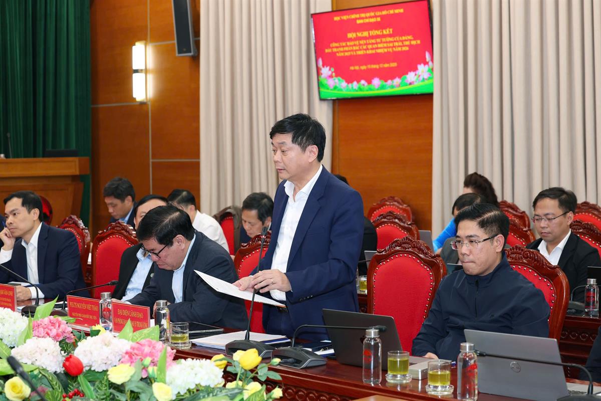 Năm 2025, Học viện triển khai toàn diện và hiệu quả công tác bảo vệ nền tảng tư tưởng của Đảng, gắn chặt giữa đào tạo, bồi dưỡng với tuyên truyền, đấu tranh trên cả không gian truyền thống và môi trường số. Nội dung bảo vệ nền tảng tư tưởng được tích hợp sâu vào các chương trình lý luận chính trị, bồi dưỡng cán bộ, giảng viên, học viên theo hướng chuyển từ truyền thụ kiến thức sang nâng cao nhận thức, thái độ và hành vi thực tiễn, tạo chuyển biến rõ nét. Song song với đó, các hoạt động truyền thông được tổ chức đồng bộ, góp phần lan tỏa mạnh mẽ thông tin chính thống, thu hút hàng trăm nghìn lượt tiếp cận và tương tác xã hội. Hệ thống báo chí, xuất bản, cổng thông tin điện tử và các nền tảng số không chỉ phản bác trực diện các quan điểm sai trái, xuyên tạc mà còn đóng góp luận cứ khoa học phục vụ xây dựng Văn kiện Đại hội XIV và các vấn đề chiến lược của Đảng. Các trường chính trị và học viện trực thuộc phát huy vai trò nòng cốt thông qua đào tạo, hội thảo, tọa đàm, các cuộc thi chính luận và tập huấn chuyên sâu, mở rộng phối hợp với các ban, bộ, ngành, địa phương, qua đó tạo sức lan tỏa sâu rộng trong hệ thống chính trị, góp phần giữ vững và củng cố trận địa tư tưởng của Đảng trong tình hình mới.