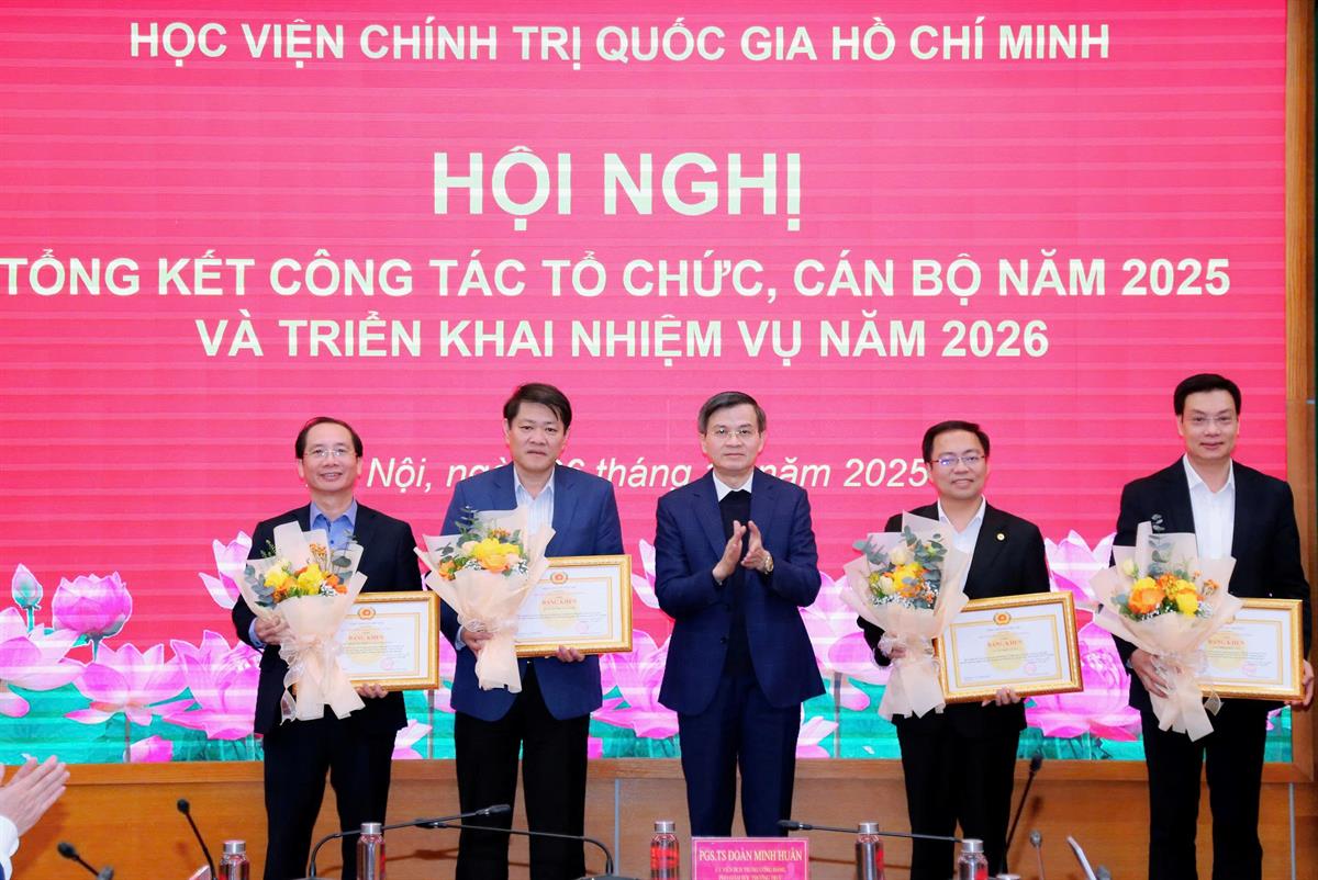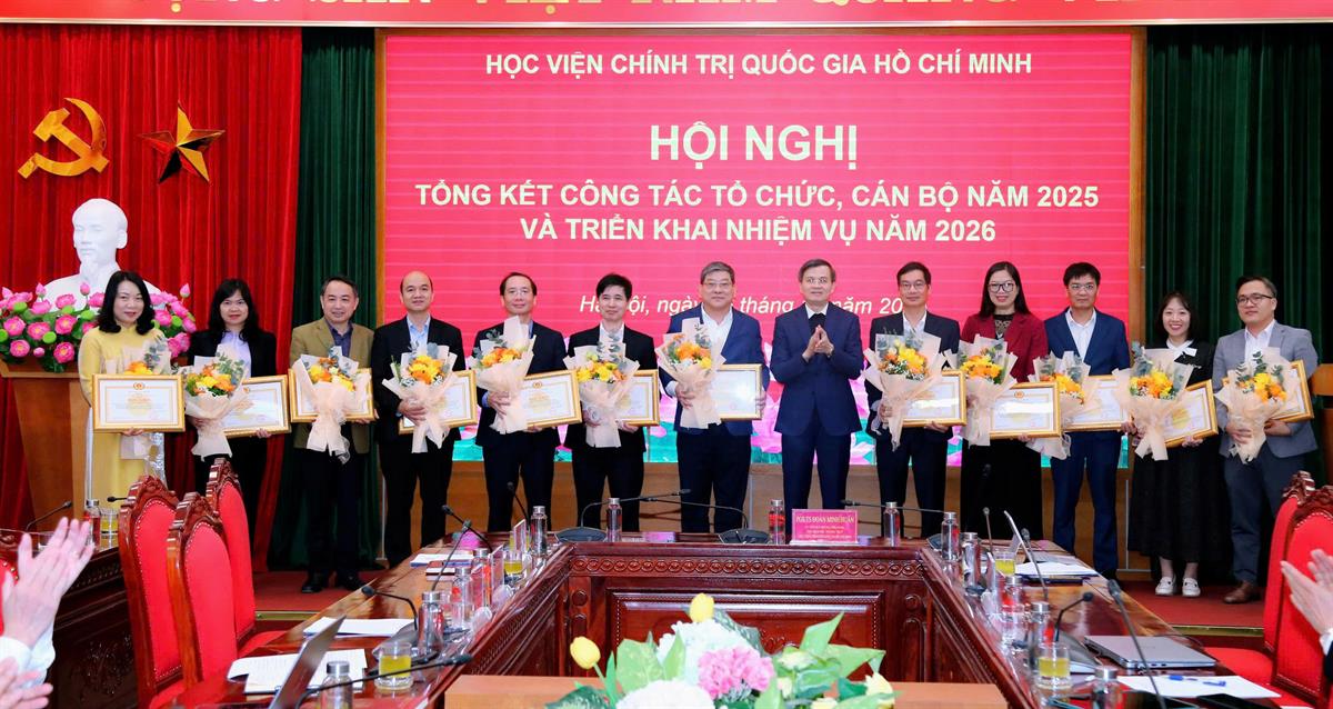 Với những thành tích đã đạt được trong triển khai thực hiện công tác tổ chức, cán bộ năm 2025, tại Hội nghị, 05 tập thể và 14 cá nhân đã được trao tặng Bằng khen của Giám đốc Học viện, trong đó có 02 tập thể và 05 cá nhân đã có thành tích xuất sắc trong công tác tham mưu về chính sách, chế độ đối với cán bộ, công chức, viên chức, người lao động trong thực hiện sắp xếp tổ chức bộ máy của Học viện Chính trị quốc gia Hồ Chí Minh; 03 tập thể và 09 cá nhân đã có thành tích xuất sắc trong công tác tham mưu tổng kết Nghị quyết số 18-NQ/TW của Ban Chấp hành Trung ương Đảng ngày 25/10/2017 “Một số vấn đề về tiếp tục đổi mới, sắp xếp tổ chức bộ máy của hệ thống chính trị tinh gọn, hoạt động hiệu lực, hiệu quả”.