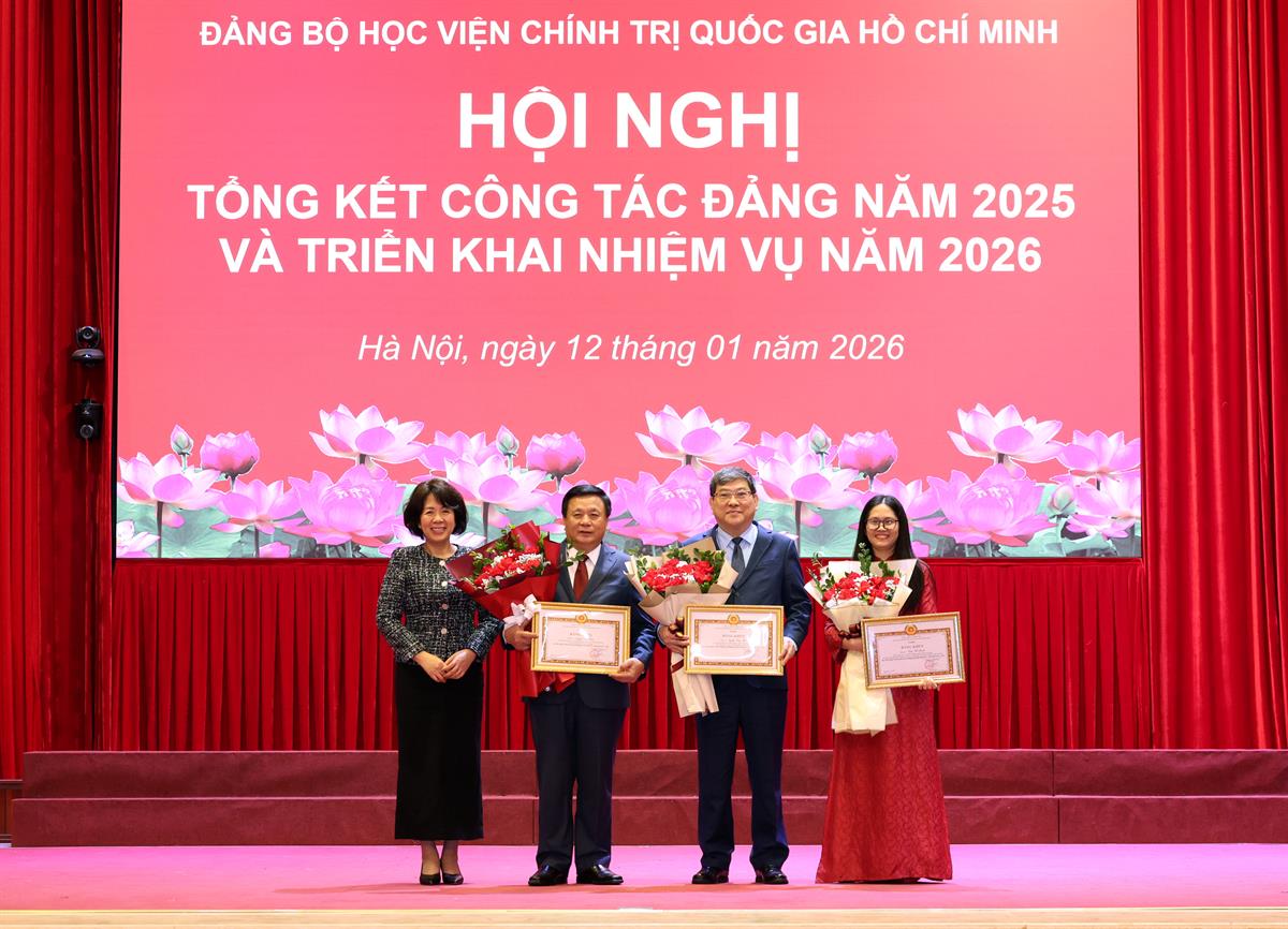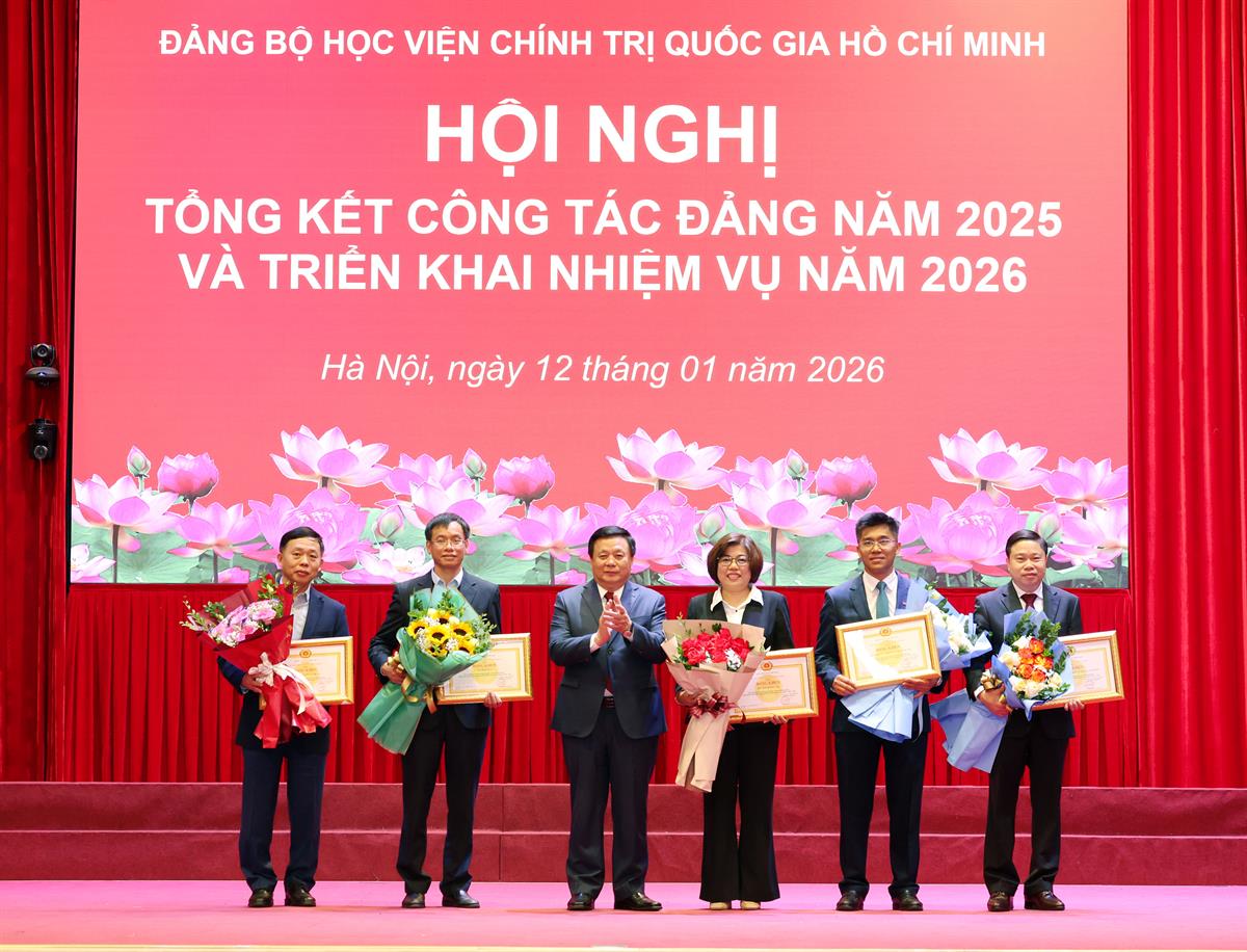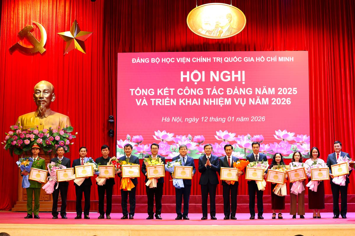 Nhân dịp này, Đảng uỷ Học viện đã trao tặng giấy khen cho 09 tổ chức đảng đạt tiêu chuẩn hoàn thành xuất sắc nhiệm vụ năm 2025; 07 đảng viên đạt tiêu chuẩn hoàn thành xuất sắc nhiệm vụ 5 năm liền từ năm 2021-2025; 05 tập thể và 26 cá nhân có thành tích xuất sắc trong công tác tổ chức Đại hội Đảng bộ Học viện lần thứ XV nhiệm kỳ 2025-2030./.
