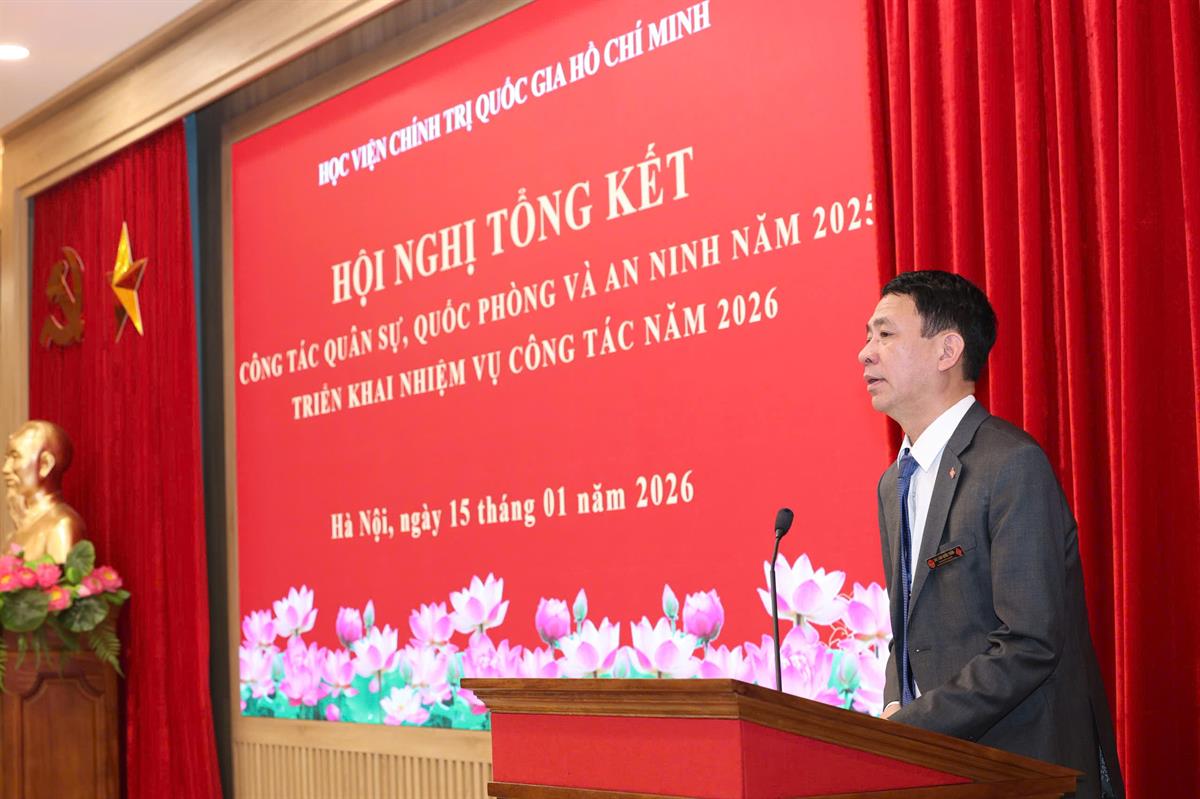 Trình bày báo cáo tổng kết công tác quốc phòng và an ninh của Học viện Chính trị quốc gia Hồ Chí Minh, PGS,TS Lâm Quốc Tuấn, Viện trưởng Viện Xây dựng Đảng, Uỷ viên Hội đồng Giáo dục Quốc phòng an ninh Học viện, Chính trị viên Ban Chỉ huy quân sự Trung tâm Học viện cho biết, năm 2025 - năm diễn ra nhiều sự kiện của đất nước, dưới sự quan tâm chỉ đạo sát sao, quyết liệt của Đảng ủy, Ban Giám đốc Học viện, Ban Chỉ huy quân sự Học viện đã tham mưu triển khai hiệu quả nhiều hoạt động nhằm bảo đảm công tác quốc phòng, an ninh trong toàn hệ thống và đạt được nhiều kết quả nổi bật.