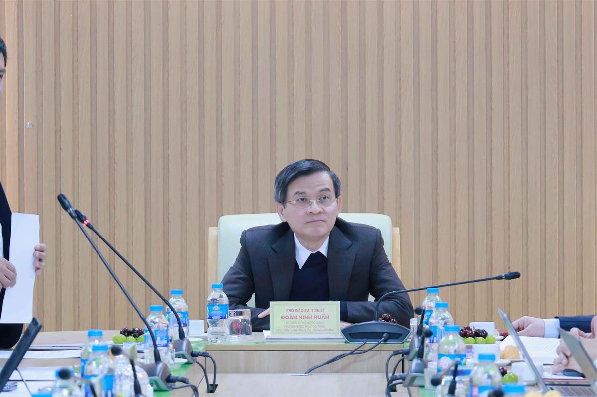 PGS,TS. Đoàn Minh Huấn – Ủy viên Trung ương Đảng, Phó Giám đốc Thường trực Học viện dự và chủ trì buổi làm việc.