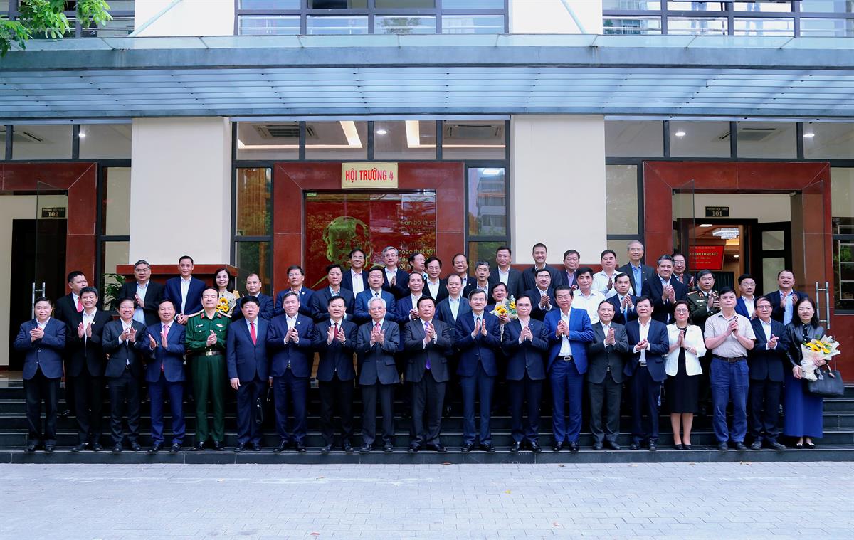 GS,TS Nguyễn Xuân Thắng và PGS,TS Đoàn Minh Huấn tặng hoa tri ân những đóng góp của các thành viên Thường trực Hội đồng, Ủy viên Hội đồng nhiệm kỳ 2021 - 2026 không tham gia Hội đồng Lý luận Trung ương nhiệm kỳ 2026-2031 (ảnh: Đức Mạnh)