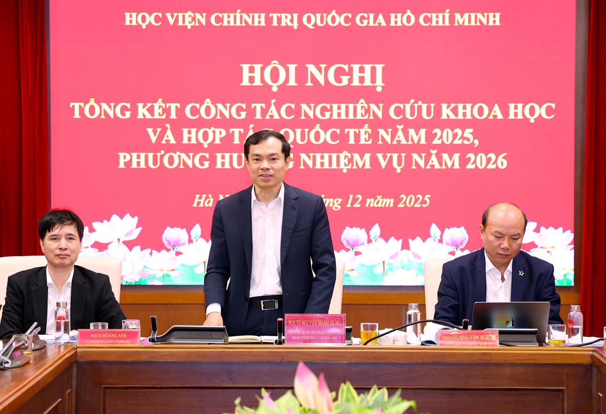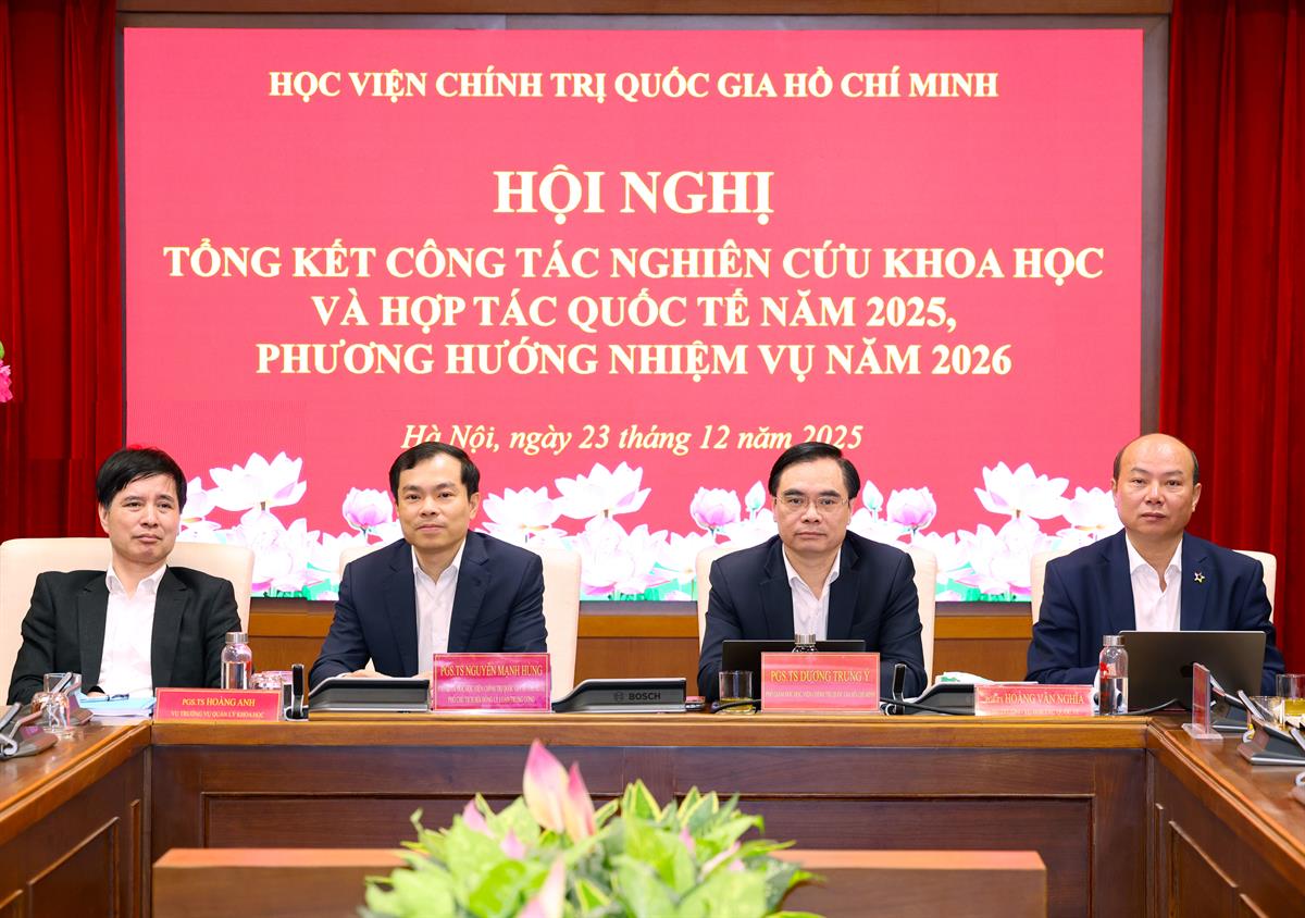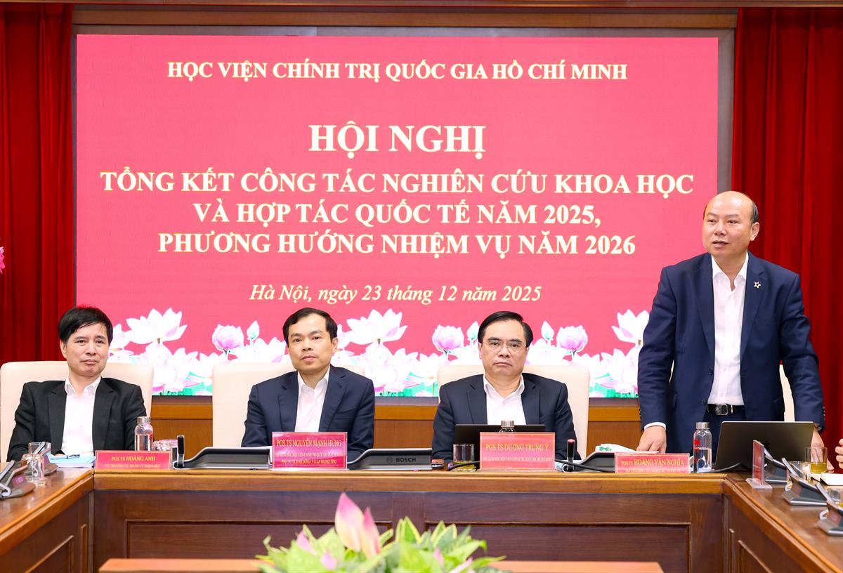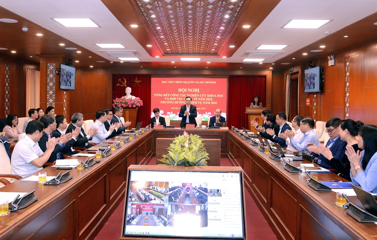 Báo cáo tổng kết cho biết, năm 2025, trong bối cảnh triển khai Quyết định số 214-QĐ/TW về chức năng, nhiệm vụ và tổ chức bộ máy, bám sát tinh thần Nghị quyết số 57-NQ/TW, Nghị quyết 59-NQ/TW, lĩnh vực khoa học và hợp tác quốc tế của Học viện Chính trị quốc gia Hồ Chí Minh tiếp tục được triển khai chủ động, bài bản, có trọng tâm, trọng điểm, bám sát nhiệm vụ chính trị của Đảng, Nhà nước và yêu cầu phát triển trong giai đoạn mới. Các hoạt động được tổ chức theo hướng tổng thể, đồng bộ, tăng cường chất lượng và hiệu quả, qua đó khẳng định rõ hơn vai trò của Học viện là trung tâm quốc gia nghiên cứu lý luận chính trị, khoa học lãnh đạo, quản lý, hành chính công; đồng thời là đầu mối tham mưu chiến lược và tư vấn chính sách quan trọng của Đảng, Nhà nước.