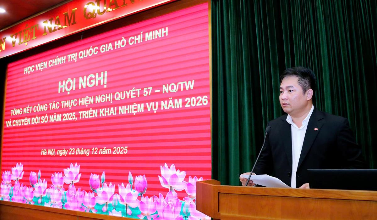 GS,TS Nguyễn Xuân Thắng cho biết, năm 2025 là năm đầu tiên toàn hệ thống Học viện triển khai Nghị quyết 57-NQ/TW. Xác định đây là nhiệm vụ chính trị trọng tâm, Đảng ủy Học viện đã ban hành Kế hoạch số 62-KH/ĐU ngày 20/5/2025 về thực hiện Nghị quyết 57-NQ/TW; Giám đốc Học viện đã thành lập Ban Chỉ đạo 57, ban hành Kế hoạch hành động số 1127-KH/HVCTQG ngày 16/10/2025 về thực hiện Nghị quyết 57-NQ/TW; hệ thống các thể chế, quy định quản lý nội bộ cũng đã cơ bản hoàn thiện, mô hình quản trị thông minh tại Học viện cũng được chính thức khai trương và đưa vào vận hành từ năm 2025, khởi động tiến trình chuyển đổi số toàn diện, phục vụ các mặt công tác của Học viện.
