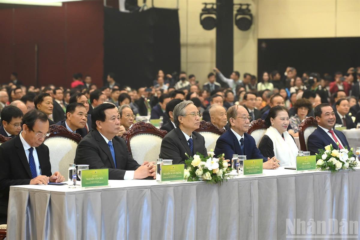 Cùng dự có các đồng chí Ủy viên Bộ Chính trị: Nguyễn Xuân Thắng, Giám đốc Học viện Chính trị quốc gia Hồ Chí Minh, Chủ tịch Hội đồng Lý luận Trung ương; Phan Đình Trạc, Bí thư Trung ương Đảng, Trưởng Ban Nội chính Trung ương; Nguyễn Văn Nên, Ủy viên Thường trực Tiểu ban Văn kiện Đại hội XIV của Đảng; Nguyễn Hòa Bình, Phó Thủ tướng Thường trực Chính phủ; các đồng chí Ủy viên Trung ương Đảng, lãnh đạo Đảng, Nhà nước, các ban, ngành, đoàn thể ở Trung ương, lãnh đạo các địa phương và các vị khách quốc tế.