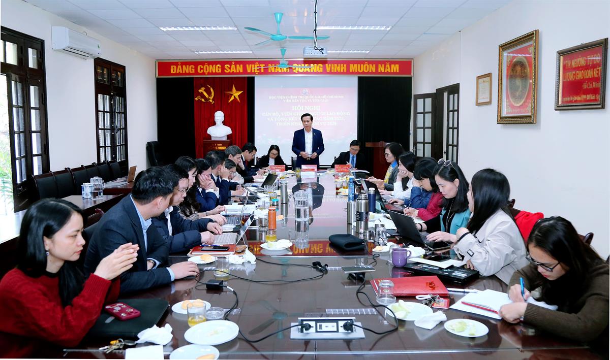 Phát biểu chỉ đạo tại Hội nghị, PGS.TS Hoàng Phúc Lâm, Phó Bí thư Đảng ủy, Phó Giám đốc Học viện đánh giá cao tinh thần trách nhiệm và kết quả công tác năm 2025 của Viện Dân tộc và Tôn giáo trong công tác nghiên cứu lý luận – thực tiễn về công tác dân tộc, tôn giáo; chất lượng các đề tài, hội thảo khoa học; kết quả đào tạo, bồi dưỡng; cùng tinh thần đoàn kết, trách nhiệm của đội ngũ viên chức, giảng viên và người lao động đơn vị. Về báo cáo tổng kết, đồng chí Phó Giám đốc Học viện nhấn mạnh báo cáo cần tiếp tục được hoàn thiện theo hướng không chỉ liệt kê hoạt động mà phải phản ánh đầy đủ bối cảnh, yêu cầu và những vấn đề đặt ra trong giai đoạn hiện nay gắn chặt với thực tiễn sắp xếp tổ chức bộ máy, mô hình chính quyền địa phương hai cấp, quá trình tổ chức Đại hội Đảng bộ Học viện; đồng thời thể hiện rõ tâm tư, nguyện vọng của viên chức và người lao động cũng như việc bảo đảm chất lượng, tiến độ của công tác giảng dạy và nghiên cứu khoa học.