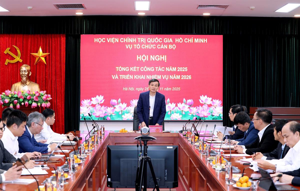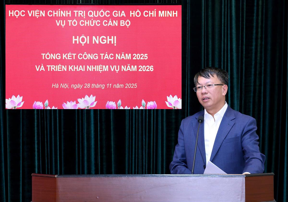 Trên cơ sở các báo cáo của Vụ Tổ chức cán bộ và ý kiến thảo luận, tham góp tại hội nghị, PGS,TS Đoàn Minh Huấn, Ủy viên Trung ương Đảng, Phó Bí thư thường trực Đảng ủy, Phó Giám đốc thường trực Học viện ghi nhận và đánh giá cao những kết quả mà Vụ đạt được trong năm 2025, đặc biệt là chất lượng tham mưu, triển khai hiệu quả các nhiệm vụ tổ chức cán bộ, xây dựng quy chế, hoàn thiện cơ cấu bộ máy và nâng cao năng lực đội ngũ cán bộ, công chức.