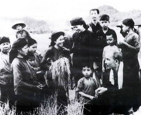 Bác Hồ thăm nông dân đang gặt lúa trên cánh đồng xã Hùng Sơn, huyện Đại Từ, Thái Nguyên, năm 1954. Ảnh: Tư liệu