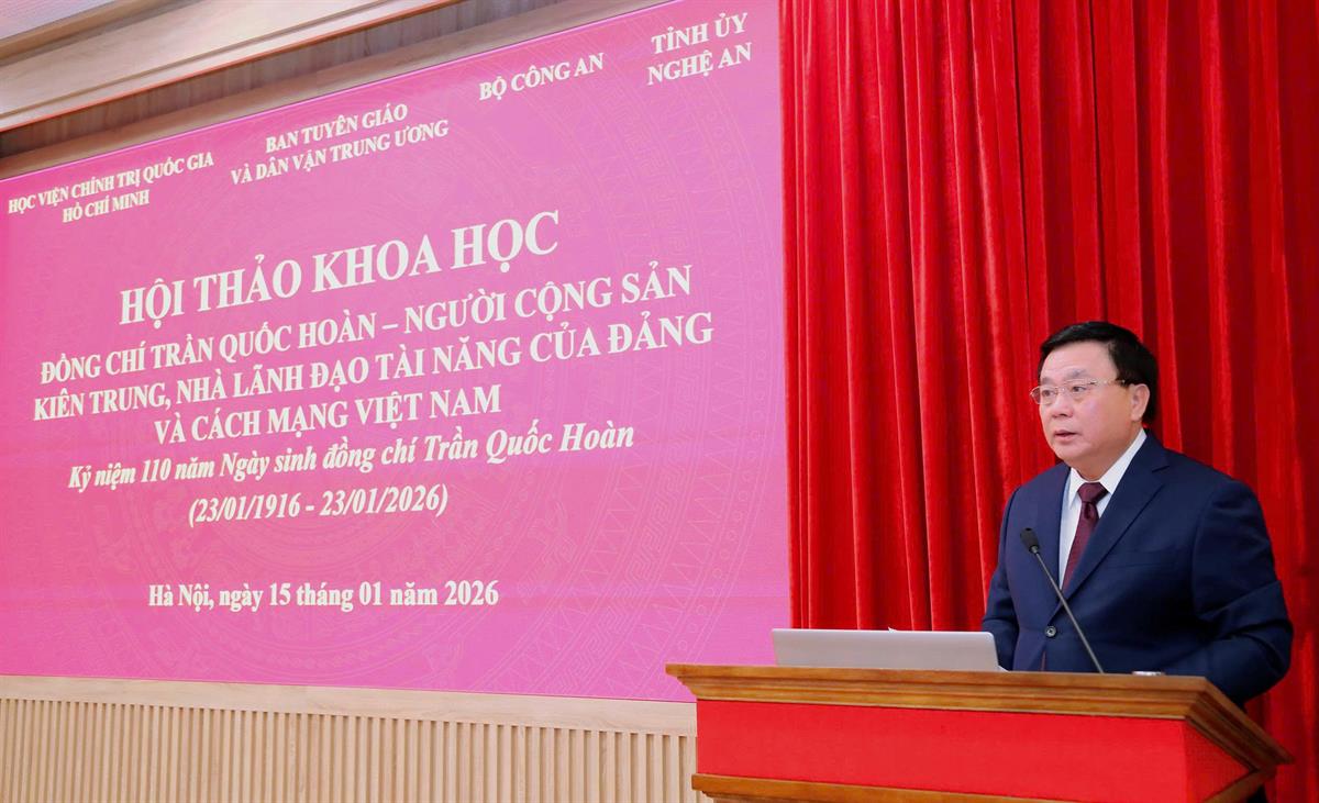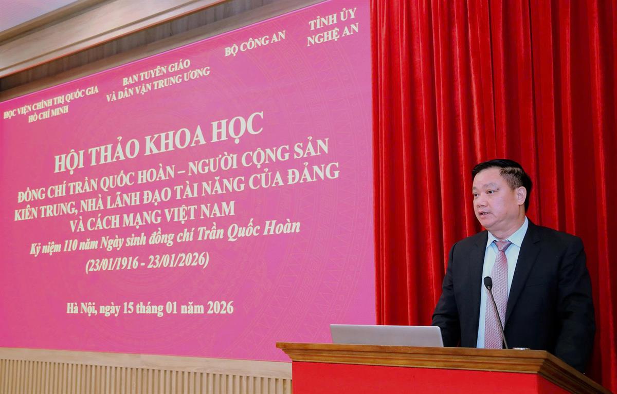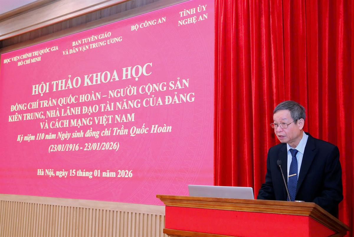 Phát biểu đề dẫn Hội thảo, GS,TS Nguyễn Xuân Thắng, Ủy viên Bộ Chính trị, Giám đốc Học viện Chính trị quốc gia Hồ Chí Minh, Chủ tịch Hội đồng Lý luận Trung ương cho biết, đồng chí Trần Quốc Hoàn - tên khai sinh là Nguyễn Trọng Cảnh, nguyên Ủy viên Bộ Chính trị, Bộ trưởng Bộ Công an, nguyên Trưởng Ban Dân vận Trung ương, người cộng sản kiên trung, nhà lãnh đạo tài năng của Đảng và cách mạng Việt Nam, người học trò ưu tú của Chủ tịch Hồ Chí Minh. Đồng chí sinh ngày 23/1/1916 tại xã Nam Trung, huyện Nam Đàn, tỉnh Nghệ An (nay là xã Thiên Nhẫn, tỉnh Nghệ An) – một vùng đất “địa linh nhân kiệt”, giàu truyền thống yêu nước và cách mạng. Trong quá trình hoạt động cách mạng, đồng chí Trần Quốc Hoàn đã được phân công đảm đương nhiều trọng trách của Đảng và Nhà nước. Trên mọi cương vị công tác, đồng chí luôn nêu cao tinh thần trách nhiệm, tận tụy cống hiến, hoàn thành xuất sắc các nhiệm vụ được giao. Với những đóng góp hết sức quan trọng cho sự nghiệp cách mạng của Đảng và dân tộc, đồng chí đã được tặng thưởng Huân chương Sao Vàng và nhiều huân, huy chương cao quý khác.