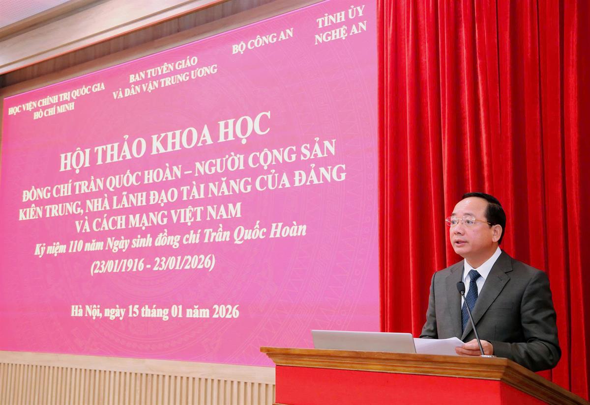 Phát biểu khai mạc Hội thảo, Đại tướng Trịnh Văn Quyết, Bí thư Trung ương Đảng, Trưởng Ban Tuyên giáo và Dân vận Trung ương khẳng định, Hội thảo khoa học “Đồng chí Trần Quốc Hoàn – Người cộng sản kiên trung, nhà lãnh đạo tài năng của Đảng và cách mạng Việt Nam” là hoạt động thiết thực nhằm ôn lại cuộc đời hoạt động cách mạng vẻ vang, tri ân những công lao, cống hiến to lớn của đồng chí Trần Quốc Hoàn đối với sự nghiệp cách mạng của Đảng và dân tộc; góp phần giáo dục lý tưởng, bồi đắp niềm tin, khơi dậy trách nhiệm và khát vọng cống hiến, nhất là đối với thế hệ trẻ hôm nay.