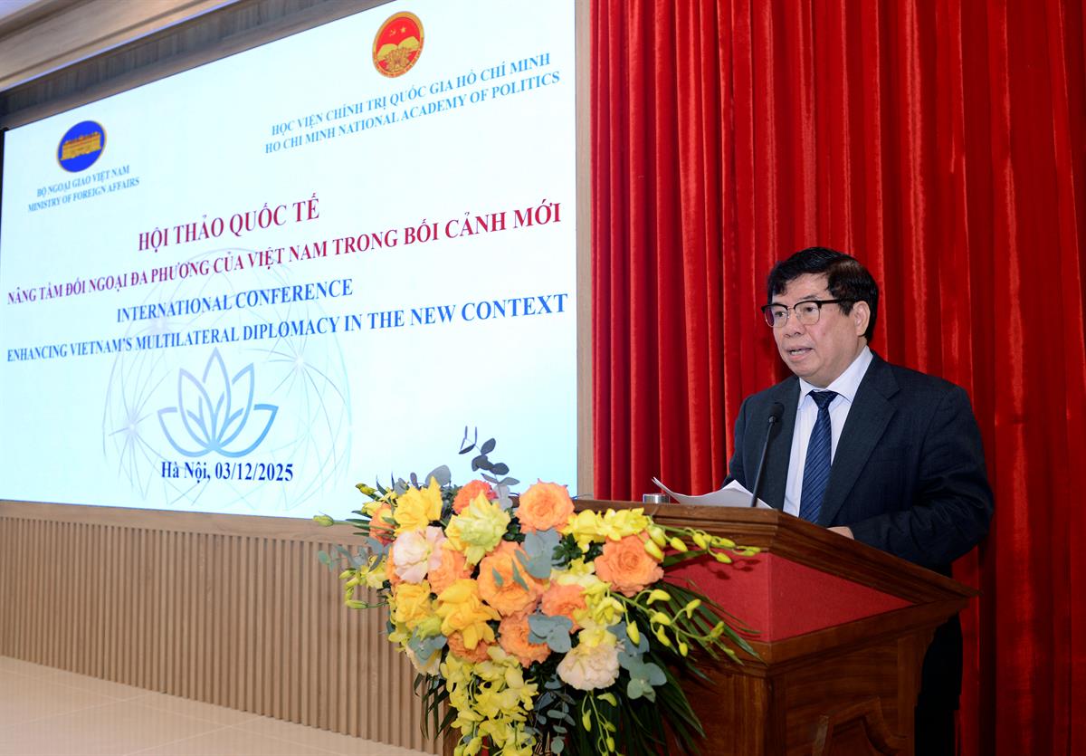 Phát biểu khai mạc, đề dẫn hội thảo, PGS,TS Hoàng Phúc Lâm, Phó Giám đốc Học viện Chính trị quốc gia Hồ Chí Minh nhấn mạnh, thế giới đang chuyển mình với tốc độ chưa từng có trong lịch sử hiện đại. Những biến động về địa chính trị, kinh tế, công nghệ và môi trường không chỉ thay đổi cách các quốc gia tương tác với nhau, mà còn định hình lại các chuẩn mực hợp tác quốc tế. Trong bối cảnh đó, đối ngoại đa phương nổi lên như một trụ cột quan trọng, nơi các quốc gia cùng nhau tìm kiếm tiếng nói chung, chia sẻ trách nhiệm và xây dựng các giải pháp bền vững cho những vấn đề toàn cầu.