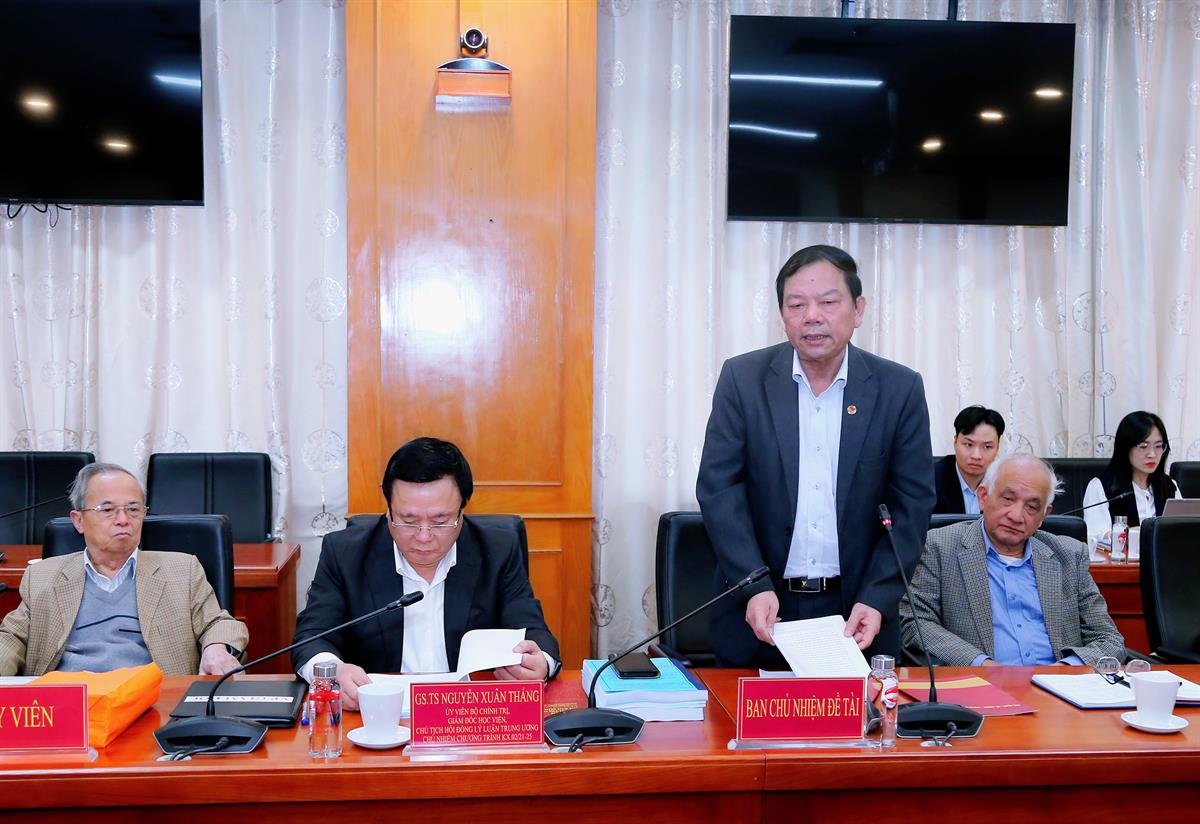 GS,TS Nguyễn Xuân Thắng, Ủy viên Bộ Chính trị, Giám đốc Học viện, Chủ tịch Hội đồng Lý luận Trung ương, Chủ nhiệm đề tài báo cáo về quá trình triển khai và các kết quả đạt được