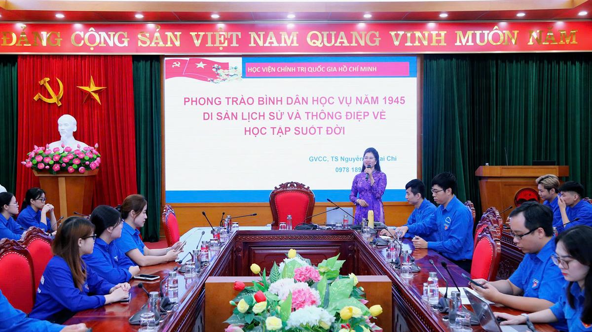 Sáng ngày 29/8/2025, tại Hà Nội, Đoàn Thanh niên Học viện Chính trị quốc gia Hồ Chí Minh tổ chức chương trình thông tin khoa học “Phong trào Bình dân học vụ 1945 – Di sản lịch sử và thông điệp học tập suốt đời đối với cán bộ, đoàn viên Học viện Chính trị quốc gia Hồ Chí Minh”. TS Nguyễn Thị Mai Chi, Giảng viên cao cấp Viện Lịch sử Đảng trực thuộc Học viện Chính trị quốc gia Hồ Chí Minh là báo cáo viên chương trình.