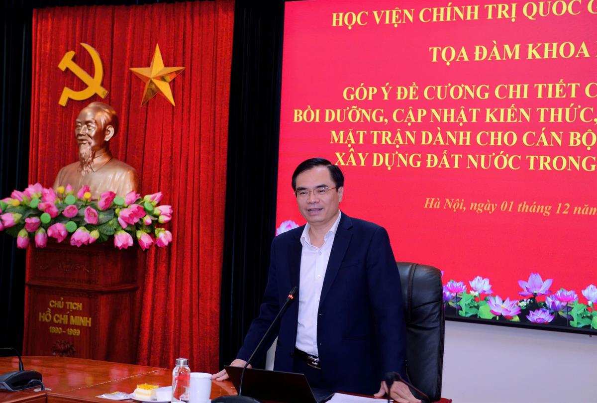Phát biểu đề dẫn Toạ đàm, PGS,TS Dương Trung Ý, Phó Giám đốc Học viện Chính trị quốc gia Hồ Chí Minh cho biết, Chương trình bồi dưỡng, cập nhật kiến thức, kỹ năng công tác mặt trận dành cho cán bộ Mặt trận Lào xây dựng đất nước trong bối cảnh mới được xây dựng gồm 24 chuyên đề trong khoảng thời gian hai tháng, nhằm mục tiêu bồi dưỡng, cập nhật kiến thức, kỹ năng cho cán bộ làm công tác mặt trận của Cộng hòa Dân chủ Nhân dân Lào.