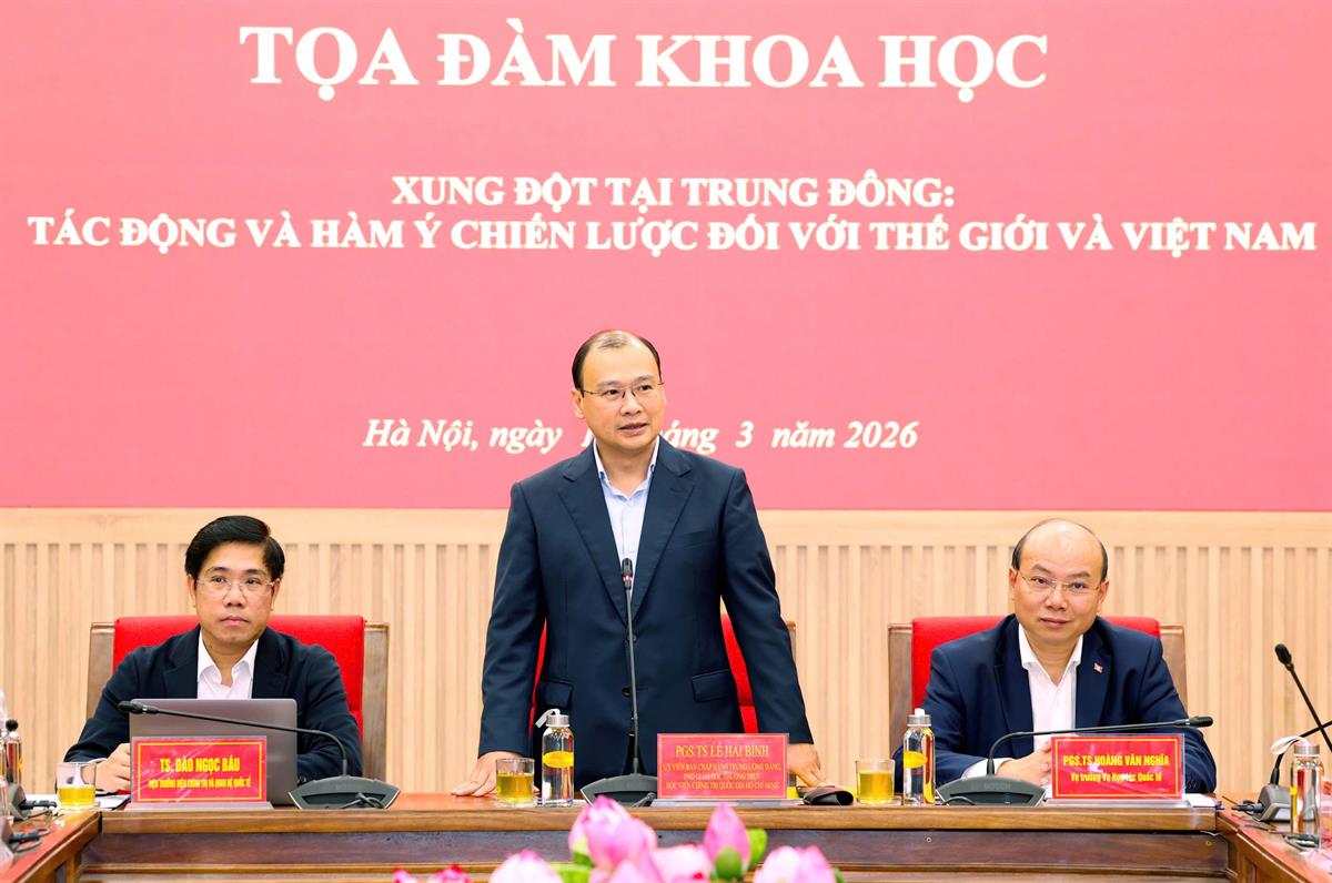 Với ý nghĩa đó, PGS,TS Lê Hải Bình đề nghị các đại biểu tham dự tập trung phân tích và làm rõ nguyên nhân, bản chất của cuộc xung đột quân sự giữa Mỹ, Israel và Iran đang diễn ra tại Trung Đông hiện nay; những tác động trực tiếp và gián tiếp đến thế giới và Việt Nam, từ đó so sánh, đối chiếu với các cuộc xung đột trước đây để nhận diện rõ cục diện và có những hàm ý chiến lược cho Việt Nam trong quản trị quốc gia.