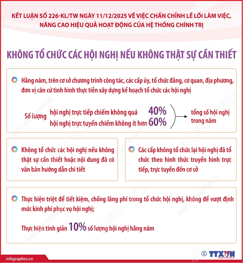 Do đó, ngày 11/12/2025, Thường trực Ban Bí thư Trần Cẩm Tú ký ban hành Kết luận số 226-KL/TW về chấn chỉnh lề lối làm việc, nâng cao hiệu quả hoạt động của hệ thống chính trị.  Điểm nổi bật của Kết luận là tính cụ thể, tính định lượng và yêu cầu tổ chức thực hiện rất rõ ràng, thể hiện quyết tâm chính trị cao trong việc khắc phục triệt để tình trạng hình thức, lãng phí và kém hiệu quả.