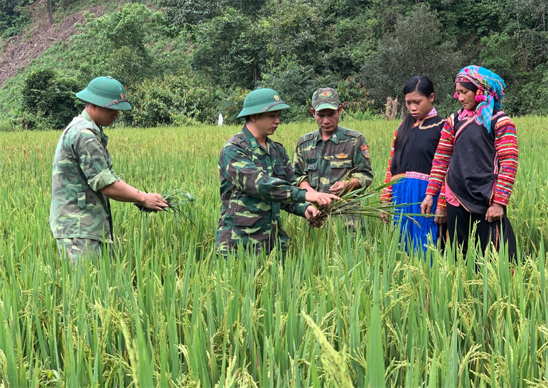 Cán bộ, chiến sĩ Đồn Biên phòng Pa Ủ giúp bà con dân tộc La Hủ ở bản Hà Si, xã Pa Ủ, huyện Mường Tè, tỉnh