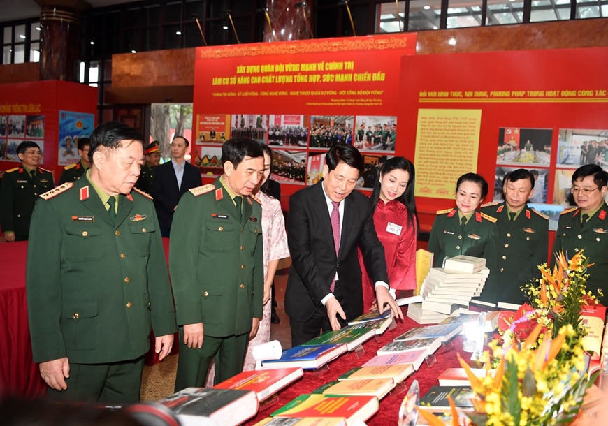 | Chủ tịch nước Lương Cường và lãnh đạo Bộ Quốc phòng tham quan các gian trưng bày tại Hội nghị quân chính toàn quân năm 2025. Ảnh: VŨ PHONG |