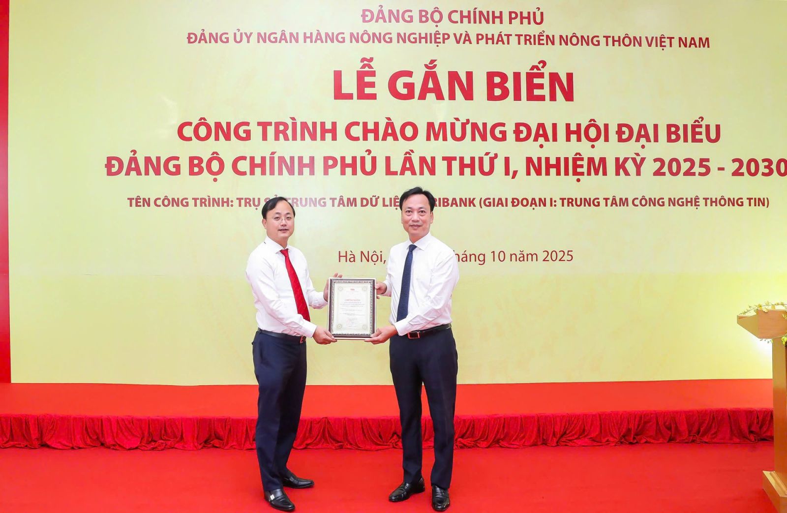 (ĐCSVN) - Sáng ngày 10/10/2025, tại Hà Nội, Đảng ủy Ngân hàng Nông nghiệp và Phát triển nông thôn Việt Nam (Agribank) đã tổ chức Lễ gắn biển công trình Trụ sở Trung tâm dữ liệu Agribank. Đây là công trình được Đảng ủy Chính phủ công nhận gắn biển công trình chào mừng Đại hội đại biểu Đảng bộ Chính phủ lần thứ I, nhiệm kỳ 2025 - 2030.