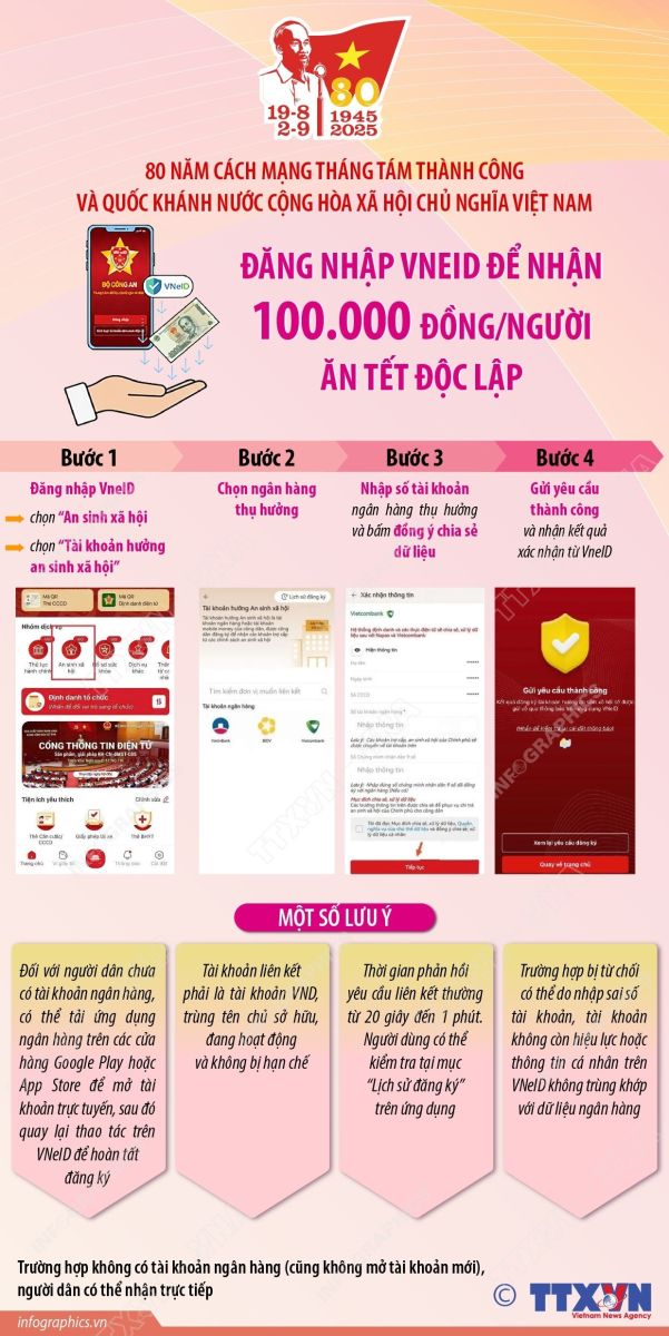 Theo Công điện số 149/CĐ-TTg ngày 28/8/2025 của Thủ tướng Chính phủ về việc tặng quà người dân nhân dịp kỷ niệm 80 năm Cách mạng Tháng Tám và Quốc khánh 2/9, công dân Việt Nam được tặng 100.000 đồng/người ăn Tết Độc lập.