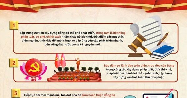 (ĐCSVN) - Văn kiện Đại hội XIV xác định tập trung ưu tiên xây dựng đồng bộ thể chế phát triển; bảo đảm sự lãnh đạo toàn diện, trực tiếp của Đảng trong công tác xây dựng pháp luật… Đây là những chủ trương, định hướng lớn về công tác pháp luật và tư pháp trong Văn kiện Đại hội XIV của Đảng.