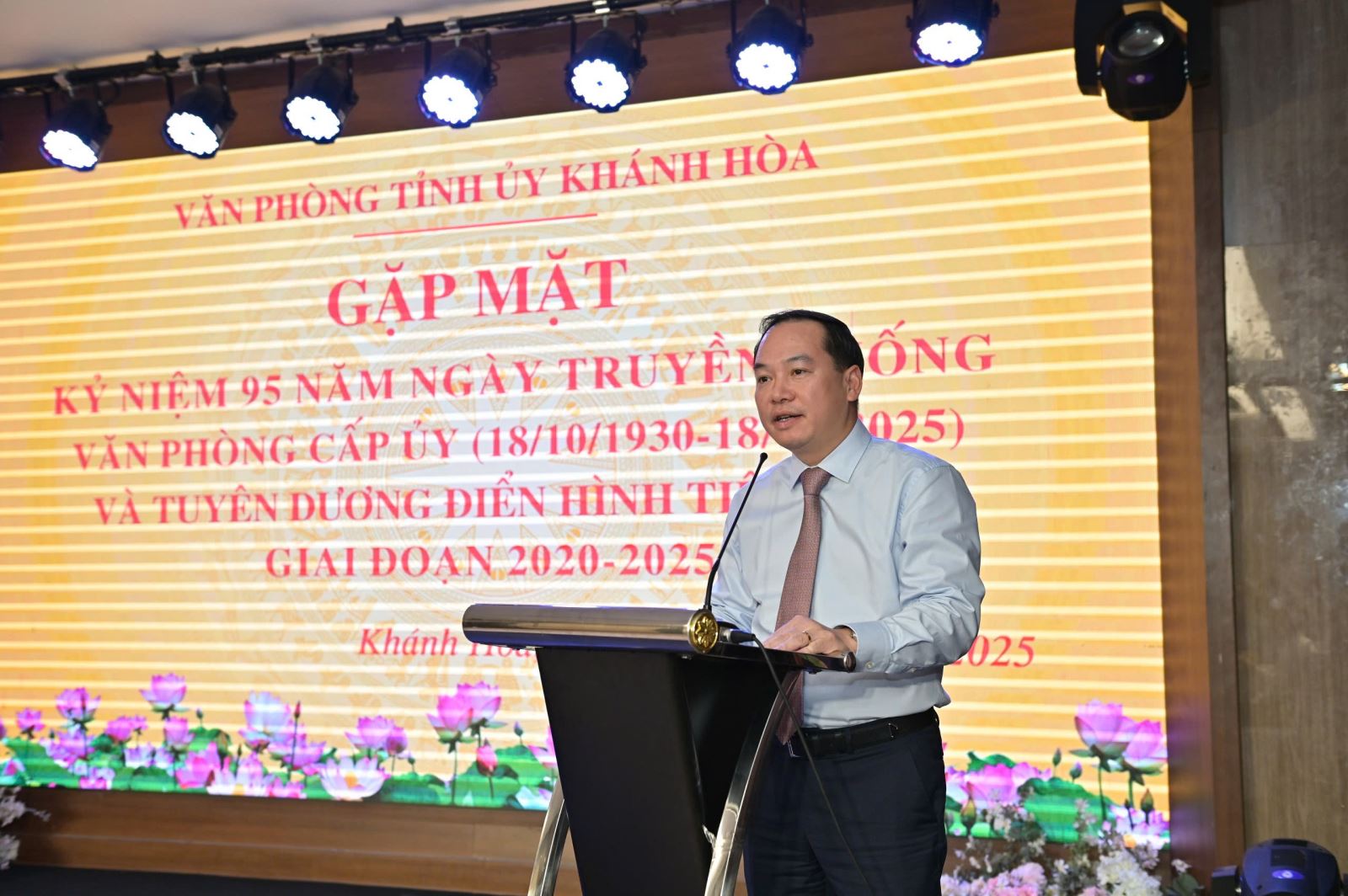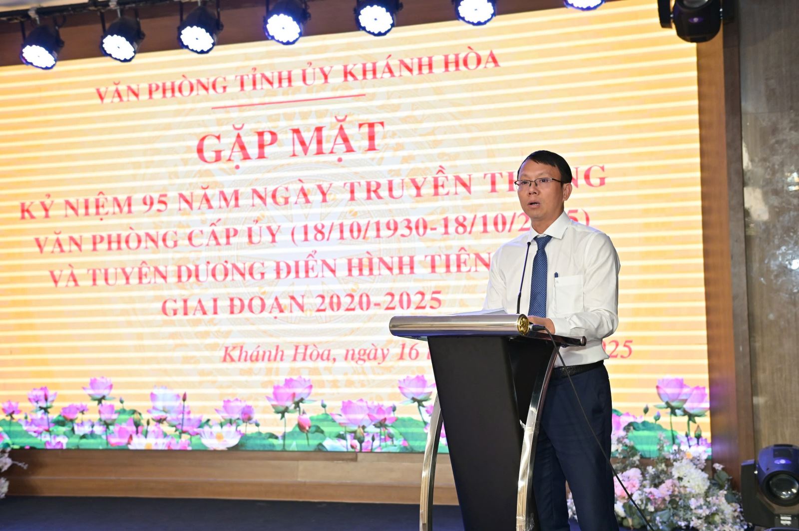 Tại buổi họp mặt, Đồng chí Nguyễn Thanh Hà, Tỉnh ủy viên, Chánh Văn phòng Tỉnh ủy phát biểu ôn lại lịch sử quá trình ra đời, trưởng thành qua các thời kỳ của Văn phòng cấp uỷ và Văn phòng Tỉnh ủy Khánh Hòa; qua đó khẳng định: Văn phòng Tỉnh ủy luôn nhận thức sâu sắc vai trò tham mưu, giúp việc cấp ủy; cán bộ, công chức, người lao động của Văn phòng Tỉnh ủy không ngừng nỗ lực, rèn luyện, giữ gìn phẩm chất chính trị, đạo đức công vụ, tinh thần trách nhiệm, hoàn thành tốt các nhiệm vụ được giao; nhất là từ khi hợp nhất đến nay, Văn phòng Tỉnh ủy kịp thời củng cố, kiện toàn tổ chức bộ máy; sắp xếp, bố trí, sử dụng cán bộ phù hợp với năng lực và sở trường công tác. Hoạt động của văn phòng từng bước ổn định, hoạt động hiệu quả; nội bộ Văn phòng đoàn kết, nhất trí, tạo nền tảng vững chắc để thực hiện tốt công tác tham mưu, phục vụ Thường trực Tỉnh ủy, Ban Thường vụ Tỉnh ủy, Ban Chấp hành Đảng bộ tỉnh trong thời gian tới.