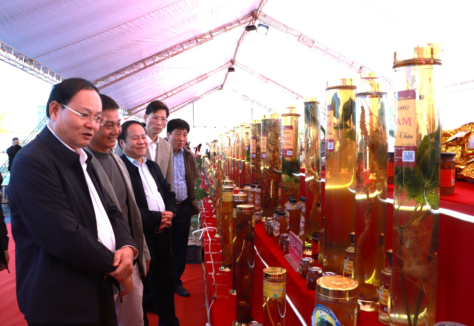 Thăm không gian trưng bày các sản phẩm Sâm Lai Châu, đồng chí Bí thư Tỉnh ủy mong muốn doanh nghiệp tiếp tục phát triển loại dược liệu quý được ví là "Quốc bảo của Việt Nam".