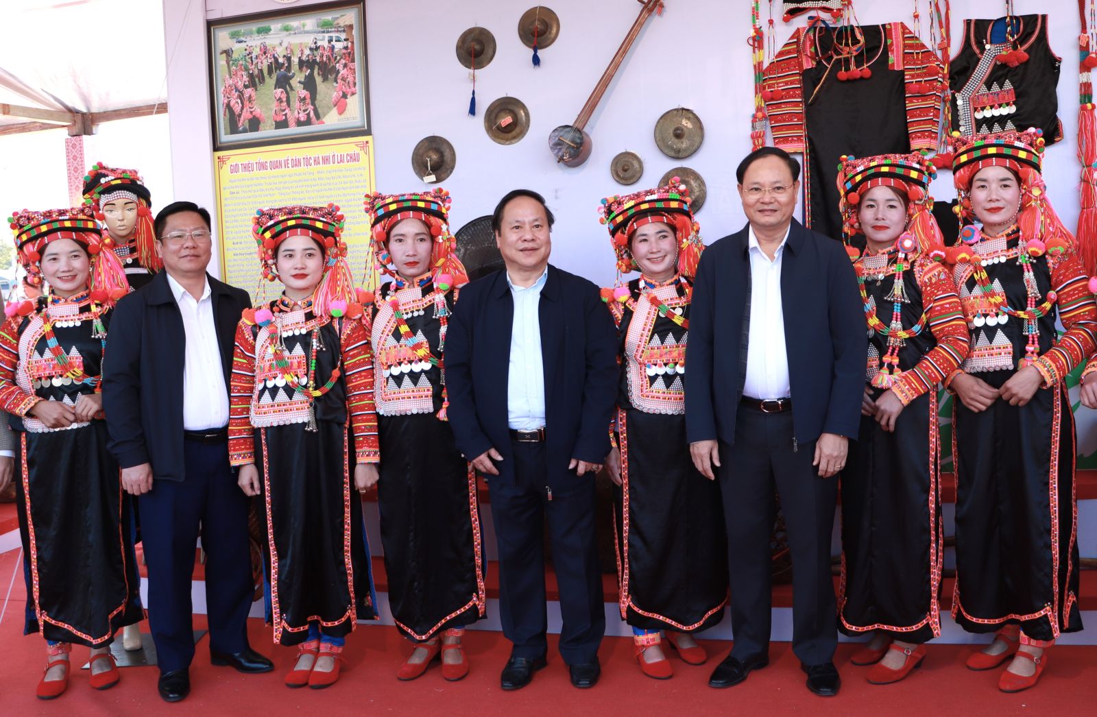 Các đồng chí lãnh đạo chụp ảnh lưu niệm với phụ nữ dân tộc Hà Nhì.