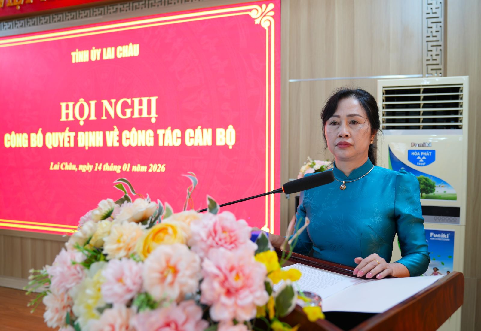 Theo đó, tại Hội nghị, đại diện lãnh đạo Ban Tổ chức Tỉnh ủy đã công bố các Quyết định điều động cán bộ. Tại Quyết định số 156-QĐ/TU, ngày 06/1/2026: Căn cứ quyết định số 6551/QĐ-ĐCT, ngày 26/12/2025 của Đoàn chủ tịch Trung ương Hội Liên hiệp Phụ nữ Việt Nam về công nhận Ban Chấp hành, Ban Thường vụ, Chủ tịch, Phó Chủ tịch Hội Liên hiệp Phụ nữ tỉnh Lai Châu khóa XIII, nhiệm kỳ 2025 - 2030; đồng chí Mùa Thị Lan, Phó Chủ tịch Hội Liên hiệp Phụ nữ tỉnh nhiệm kỳ 2025 - 2030 thôi giữ chức Phó Giám đốc Sở Tư pháp; điều động đến nhận nhiệm vụ tại cơ quan Ủy ban Mặt trận Tổ quốc tỉnh từ ngày 10/1/2026.