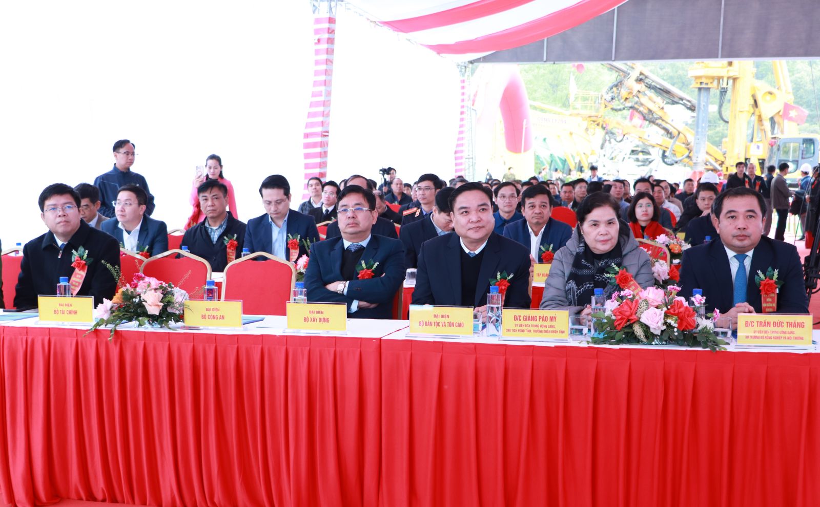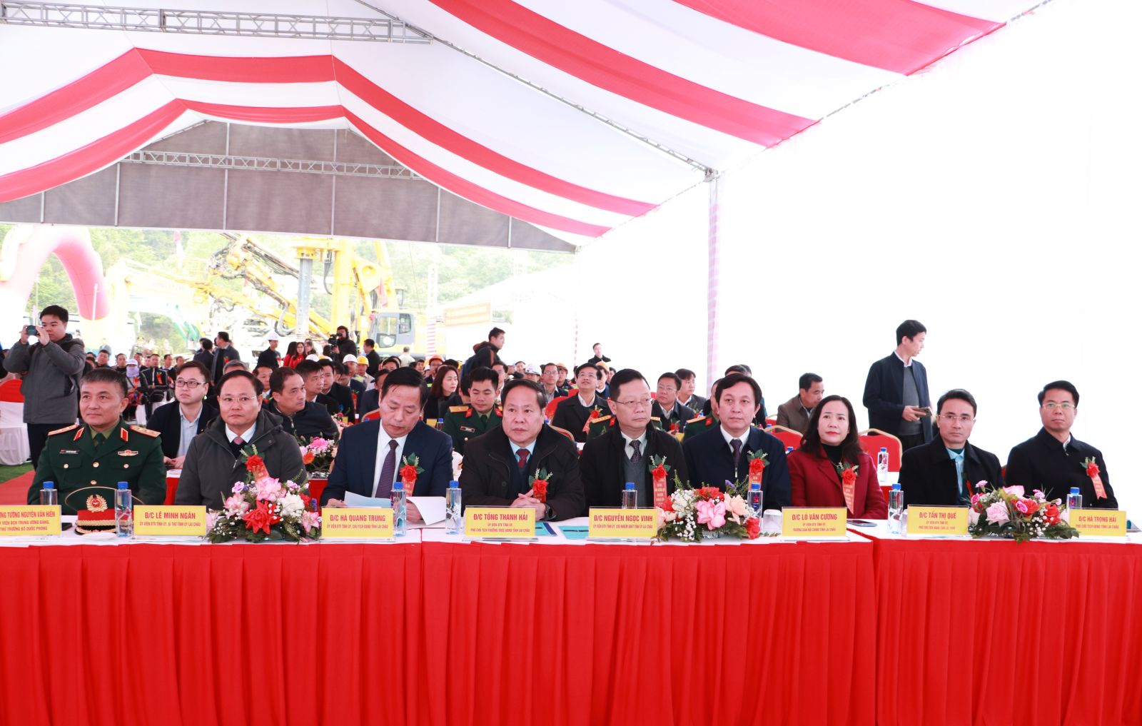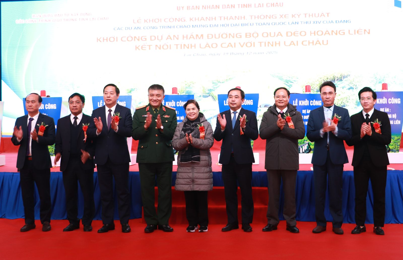 Tại buổi Lễ, các đại biểu đã thực hiện nghi thức khởi công Dự án Hầm đường bộ qua đèo Hoàng Liên kết nối tỉnh Lào Cai với tỉnh Lai Châu.