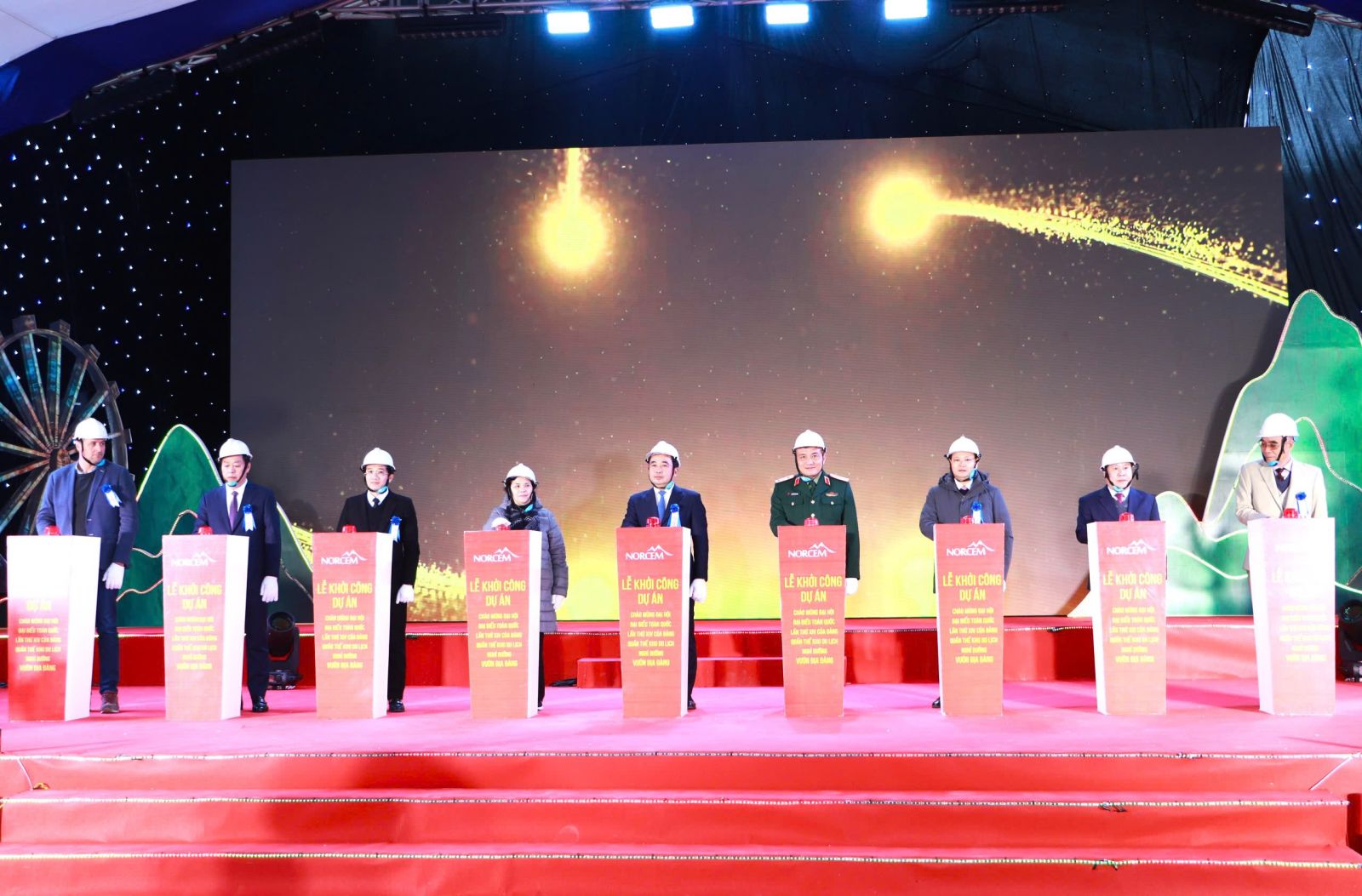 Tại buổi Lễ, các đại biểu đã thực hiện nghi thức khởi công Dự án Quần thể du lịch nghỉ dưỡng Vườn địa đàng Sơn Bình, tỉnh Lai Châu.