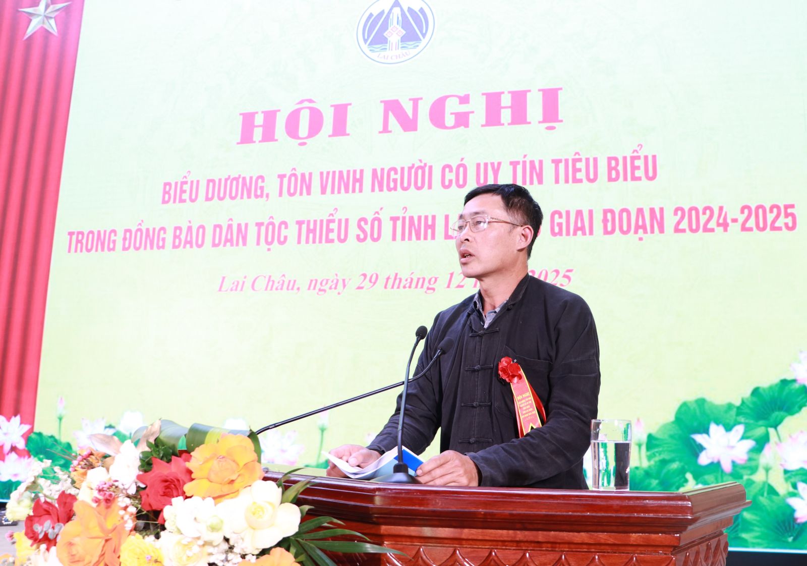 Nhân dịp này, Chủ tịch UBND tỉnh Lai Châu tặng Bằng khen cho 38 cá nhân; Sở Dân tộc và Tôn giáo tặng Giấy khen cho 20 cá nhân là người có uy tín tiêu biểu, có thành tích xuất sắc đóng góp trong phát triển kinh tế - xã hội, bảo vệ an ninh trật tự ở cơ sở giai đoạn 2024 - 2025. Đồng thời, tặng quà cho người uy tín tiêu biểu về dự Hội nghị.