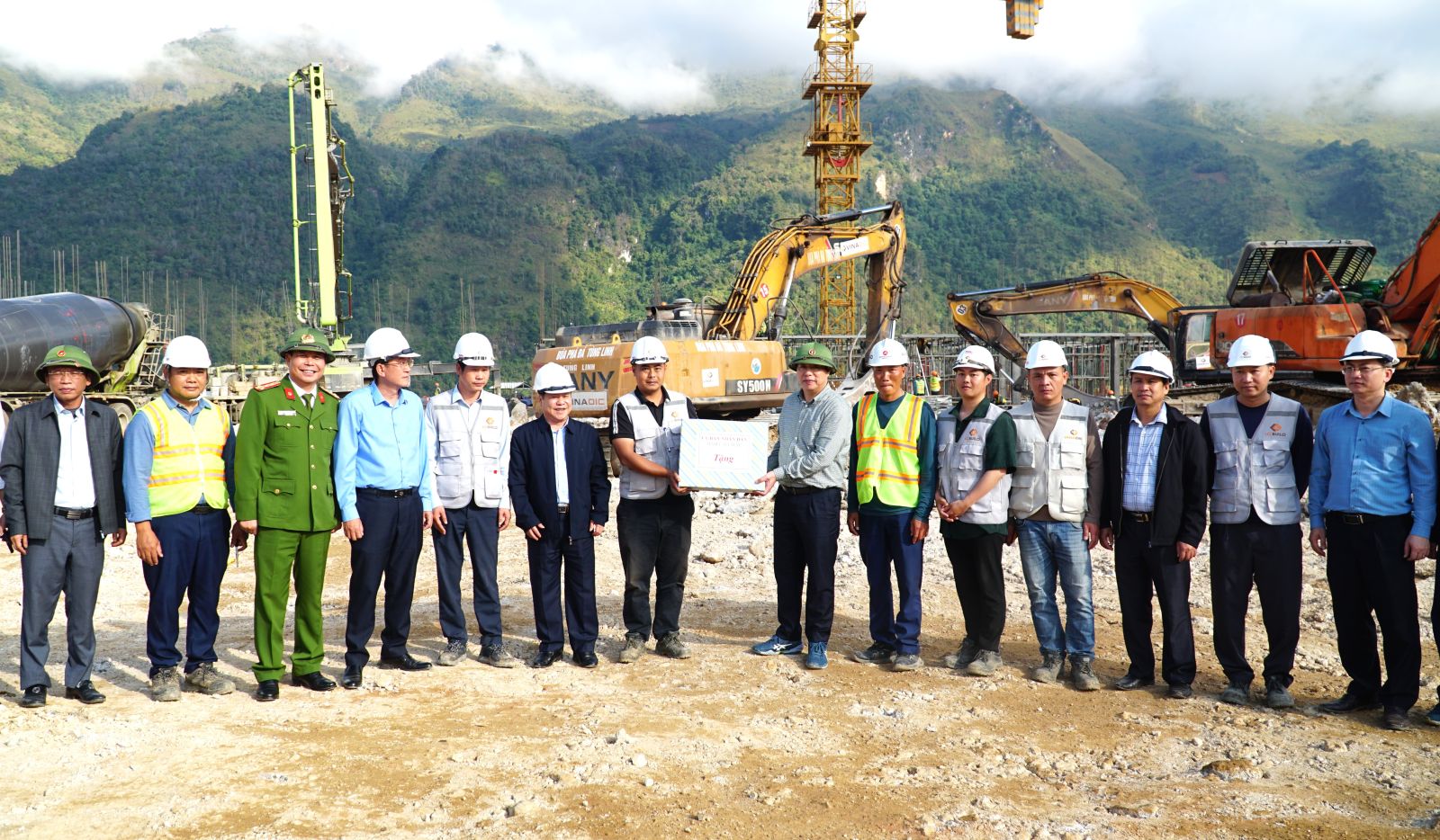 Dịp này, đồng chí Chủ tịch UBND tỉnh cùng Đoàn công tác đã tặng quà động viên công nhân đang thi công trên công trường.