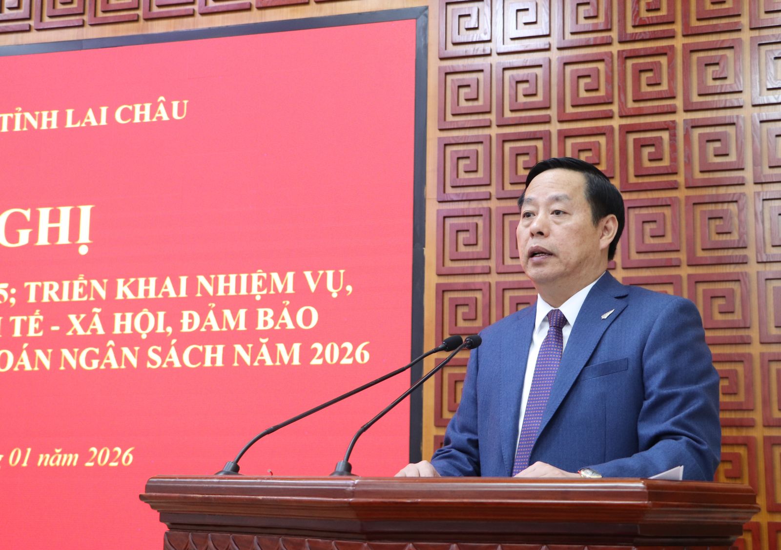Phát biểu khai mạc Hội nghị, đồng chí Hà Quang Trung - Phó Bí thư Tỉnh ủy, Chủ tịch UBND tỉnh khẳng định, năm 2025, trong bối cảnh có nhiều thuận lợi và thách thức đan xen, ngay từ đầu năm, UBND tỉnh đã sớm giao chỉ tiêu kế hoạch; kịp thời ban hành các kế hoạch, văn bản chỉ đạo điều hành; xây dựng và triển khai kịch bản tăng trưởng, đồng thời hợp nhất, sáp nhập các cơ quan chuyên môn thuộc UBND tỉnh và thực hiện chính quyền địa phương 2 cấp bảo đảm nề nếp, thông suốt, hiệu quả. Dưới sự lãnh đạo, chỉ đạo sâu sát của Tỉnh ủy, đứng đầu là đồng chí Bí thư Tỉnh ủy; sự giám sát, đồng hành của HĐND tỉnh; sự phối hợp của Ủy ban MTTQ Việt Nam tỉnh và sự nỗ lực của các cấp, các ngành, địa phương, tỉnh Lai Châu cơ bản hoàn thành các chỉ tiêu phát triển kinh tế - xã hội: Tốc độ tăng GRDP năm 2025 đạt 7,52%, bảo đảm theo kịch bản tăng trưởng được Chính phủ giao; thu ngân sách trên địa bàn đạt 3.573 tỷ đồng, là mức thu cao nhất từ trước đến nay; công tác đầu tư công, các chương trình mục tiêu quốc gia được quan tâm triển khai và giải ngân đạt kết quả tích cực; chương trình xóa nhà tạm, nhà dột nát được triển khai quyết liệt, tạo chuyển biến rõ nét về an sinh xã hội; một số công trình, dự án trọng điểm và các trường phổ thông nội trú liên cấp Tiểu học và Trung học cơ sở tại 5 xã biên giới đã được khởi công bảo đảm đúng tiến độ theo chỉ đạo của Trung ương và của Tỉnh ủy.