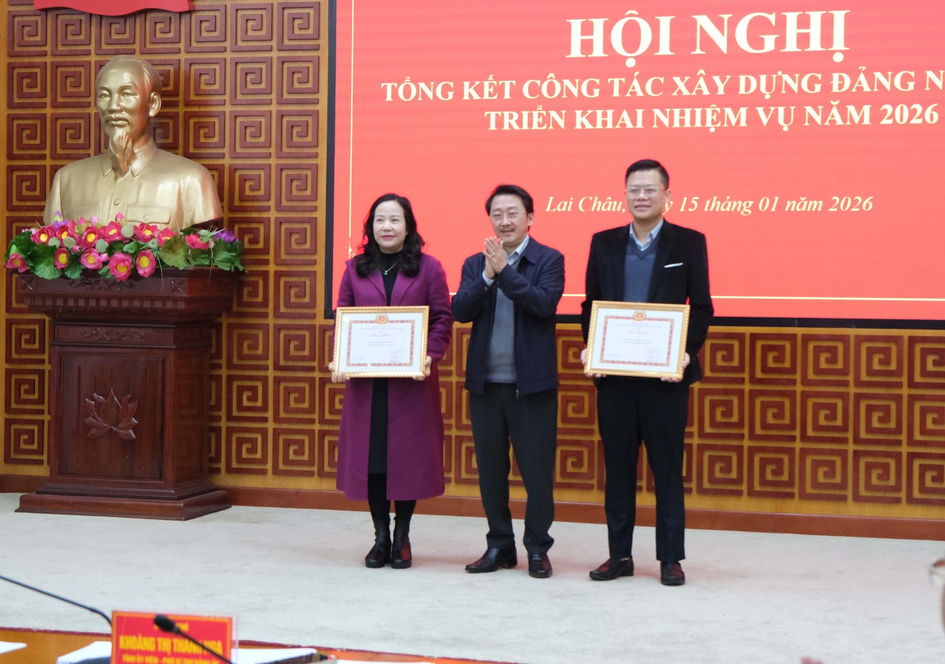 Đồng chí Sùng A Hồ – Phó Bí thư Thường trực Tỉnh ủy, Chủ tịch Ủy ban MTTQ Việt Nam tỉnh, Bí thư Đảng ủy các cơ quan Đảng tỉnh trao Giấy khen cho các tập thể có thành tích xuất sắc trong công tác xây dựng Đảng năm 2025.