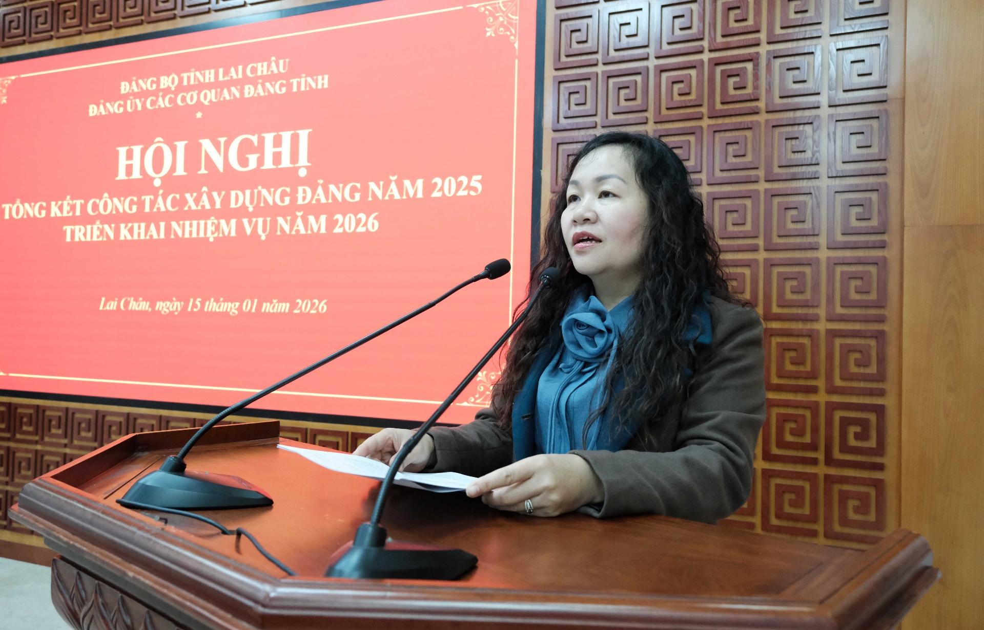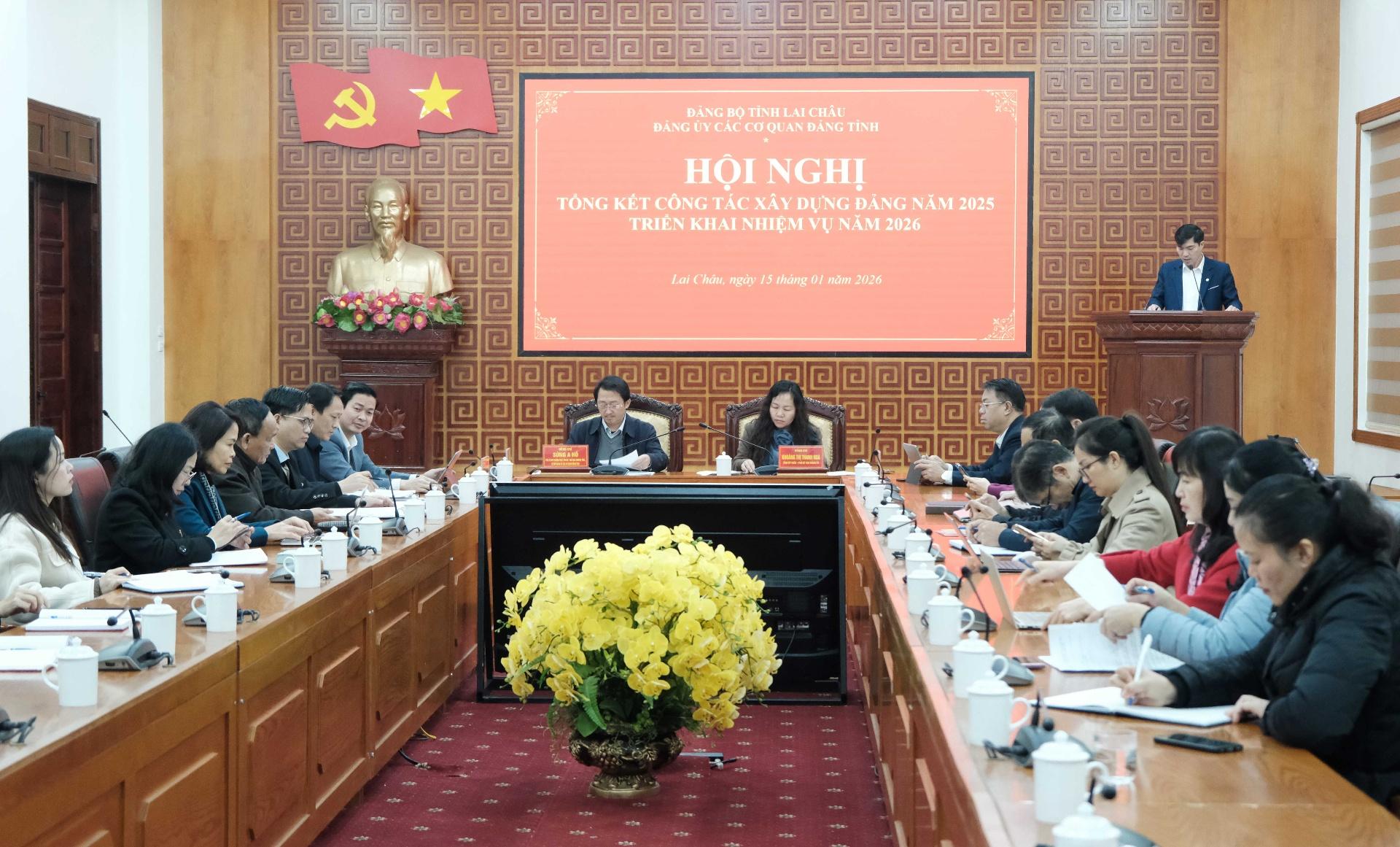 Phát biểu kết luận Hội nghị, đồng chí Sùng A Hồ – Phó Bí thư Thường trực Tỉnh ủy, Chủ tịch Ủy ban MTTQ Việt Nam tỉnh, Bí thư Đảng ủy các cơ quan Đảng tỉnh nhấn mạnh, năm 2026 là năm bản lề đặc biệt quan trọng trong việc triển khai Nghị quyết Đại hội Đảng bộ tỉnh lần thứ XV và Nghị quyết Đại hội Đảng bộ các cơ quan Đảng tỉnh nhiệm kỳ 2025–2030, nhất là trong bối cảnh tổ chức bộ máy đã được sắp xếp tinh gọn, mô hình chính quyền địa phương hai cấp đi vào vận hành toàn diện. Đồng chí yêu cầu, các cấp ủy, tổ chức đảng trong toàn Đảng bộ phải tiếp tục nâng cao năng lực lãnh đạo và sức chiến đấu, giữ vững kỷ cương, kỷ luật Đảng, phát huy vai trò nêu gương của cán bộ, đảng viên, nhất là người đứng đầu. Trọng tâm là đẩy mạnh chuyển đổi số trong công tác Đảng, xây dựng hệ thống dữ liệu, hồ sơ, quy trình làm việc trên môi trường số đồng bộ, thống nhất, bảo đảm phục vụ kịp thời công tác lãnh đạo, chỉ đạo và quản lý đảng viên, tổ chức đảng.