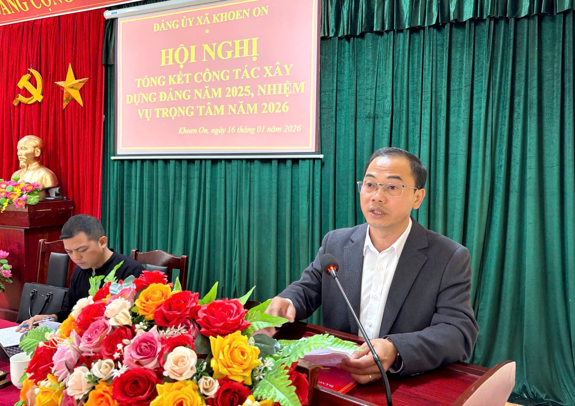 Phát biểu kết luận hội nghị, đồng chí Trịnh Ngọc Hải - Bí thư Đảng ủy, Chủ tịch HĐND xã Khoen On đánh giá cao những kết quả đạt được trong công tác Đảng và các tập thể, cá nhân có thành tích xuất sắc năm 2025. Đồng thời đề nghị, cán bộ, đảng viên tăng cường đoàn kết, trách nhiệm, nâng cao hiệu lực, hiệu quả công tác lãnh đạo, chỉ đạo, điều hành; tiếp tục củng cố, phát huy sức mạnh đại đoàn kết toàn dân; Đẩy mạnh chuyển đổi số, nâng cao năng lực ứng dụng công nghệ thông tin trong hoạt động của Đảng và hệ thống chính trị; Chú trọng phát triển kinh tế - xã hội, thực hiện hiệu quả các dự án hạ tầng, ưu tiên giao thông, nước sạch, nông nghiệp giá trị cao…